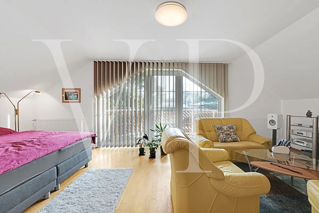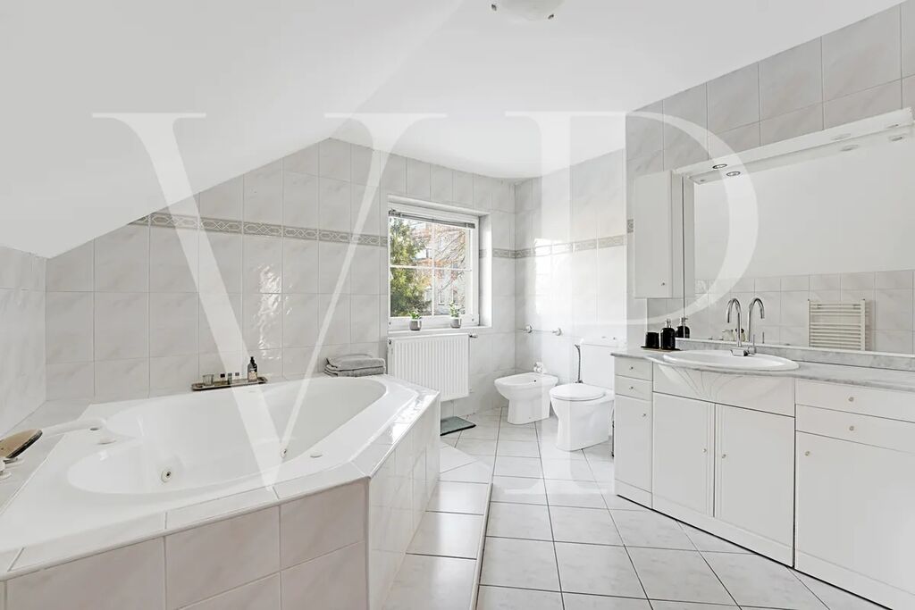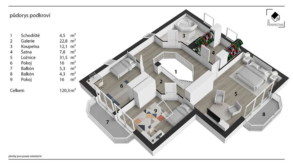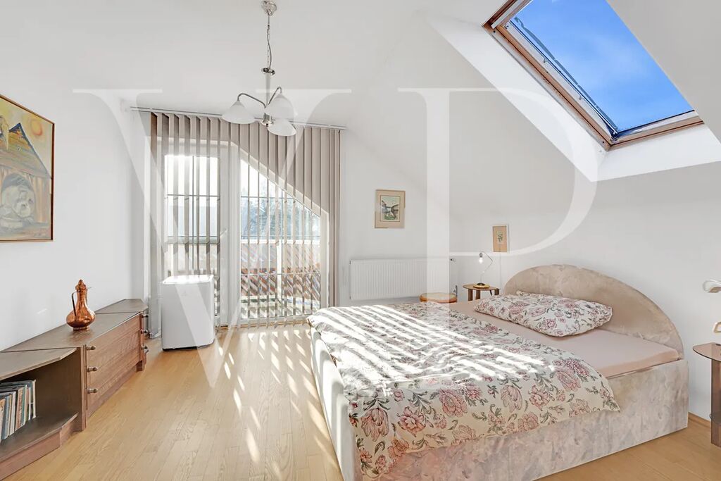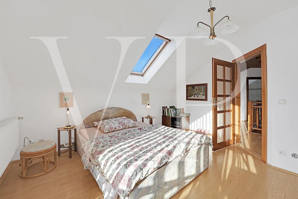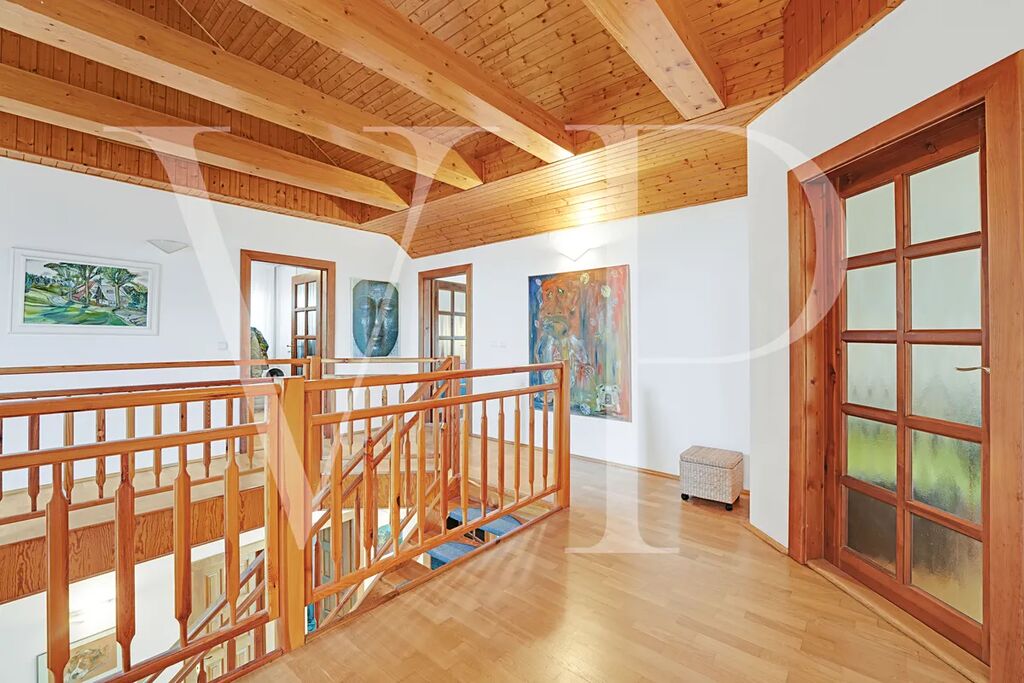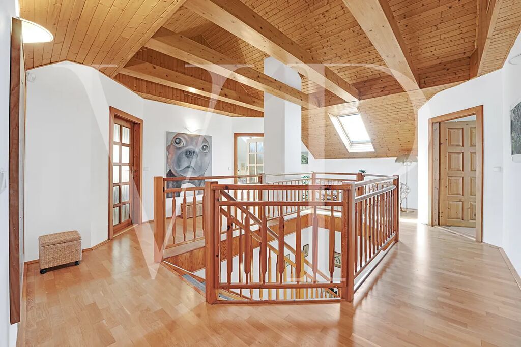 Podkroví nabízí velkou galerie, tři ložnice s balkóny, šatnu a koupelnu s vanou, bidetem a toaletou. Pod střechou jsou praktické půdní prostory pro uskladnění například sezónního oblečení.