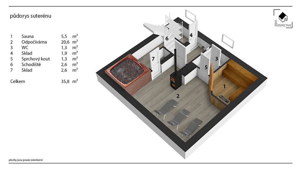 Dominantou suterénu je finská sauna s odpočívárnou, toaletou a sprchovým koutem. Dále se zde nachází velký chladící box, pánem domu a nadšencem do myslivosti, využívaný na zvěřinu, komora a technická místnost.