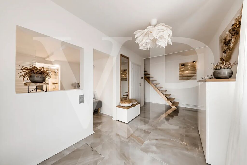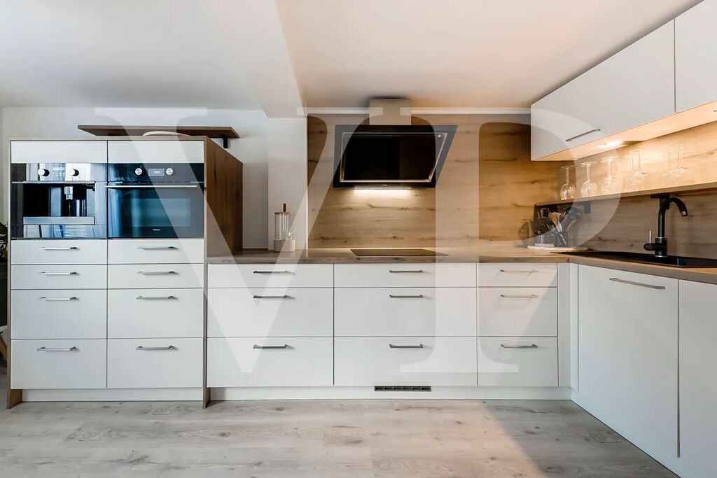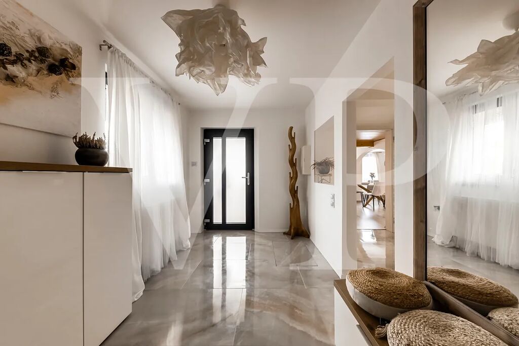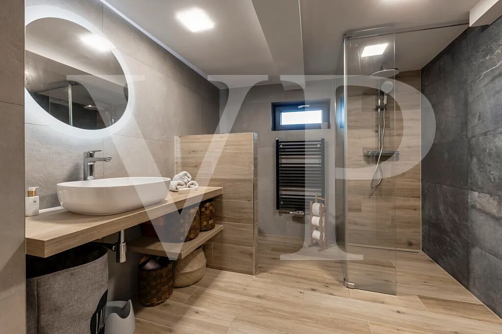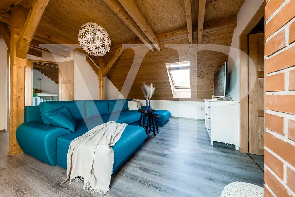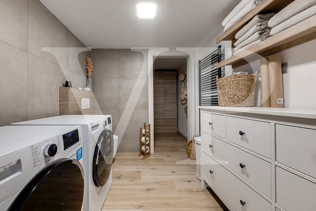 Interiér je dokonalým propojením dřeva, doplněné o designovou dlažbu, luxusní spotřebiče a hlavně je zde na každém kroku cítit otisk vkusného a praktického využití každého koutu.