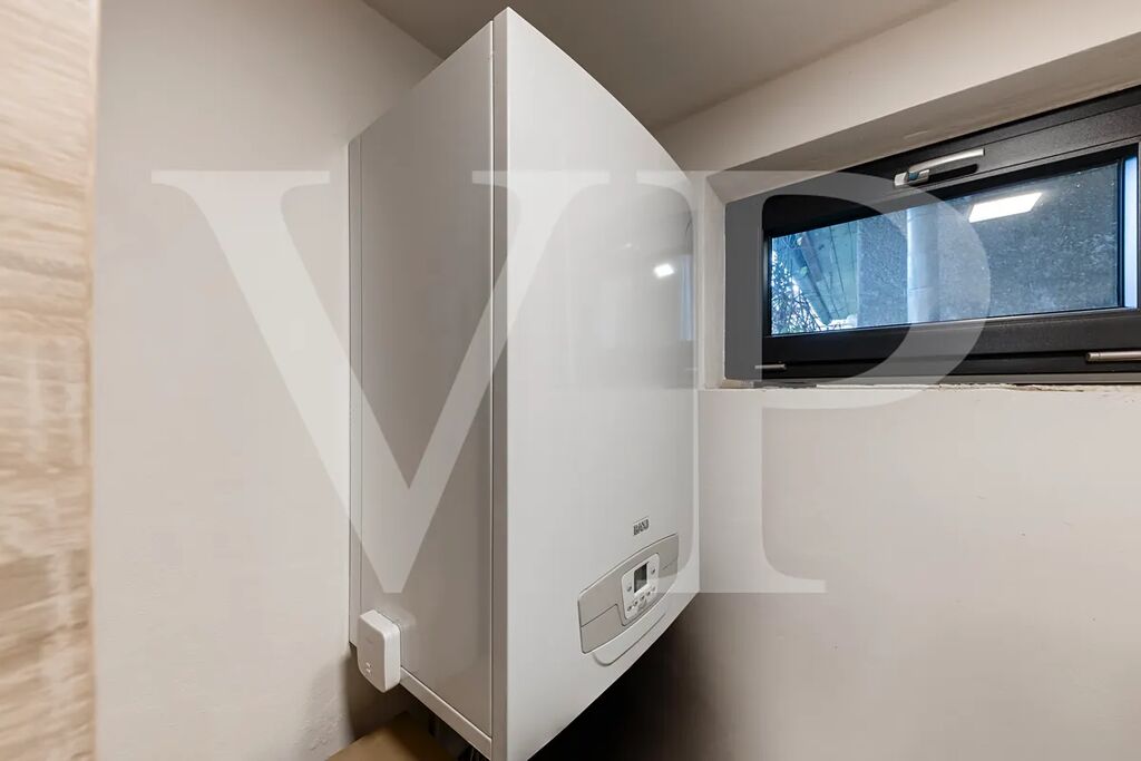 Vytápění je řešené kombinovaným plynovým kotlem s ohřevem vody. V obývacím pokoji je moderní krbová vložka s pomalým hořením a horkovzdušným rozvodem do domu. V místnostech jsou umístěna topná tělesa a v koupelně je podlahové vytápění a elektrický žebřík. Do domu je přivedena obecní voda a odpad je svedený do septiku.