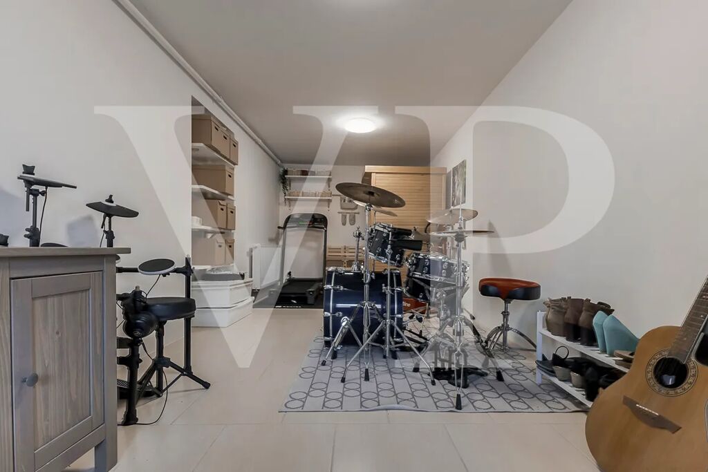 Přízemí je dělené na zádveří a předsíň, obývací pokoj s krbovou vložkou, vybavený kuchyňský kout s lux. vestavěnými spotřebiči, koupelnu se sprchovým koutem a prádelnou s toaletou a tech. místnost se šatnou. Původní garáž je využívaná jako pracovna ve které se nachází infrasauna a mini fitness, vstup ze zahrady.