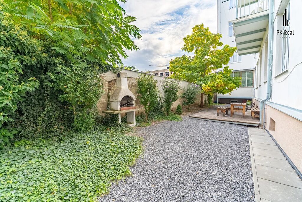 K bytu dále náleží zabezpečená prostorná sklepní kóje o výměře 4 m². K užívání dům dále nabízí společnou zahradu ve vnitrobloku s možností posezení a kočárkárnu.