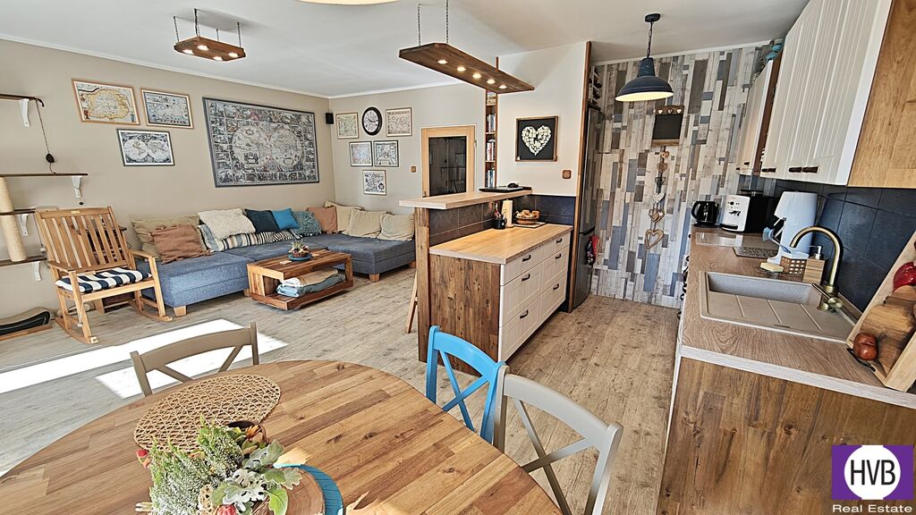 Dispozice nabízí prostorný obývací pokoj s moderně zařízenou kuchyní a jídelním koutem, 3 pokoje, koupelnu s WC, předsíň, komoru a lodžii .