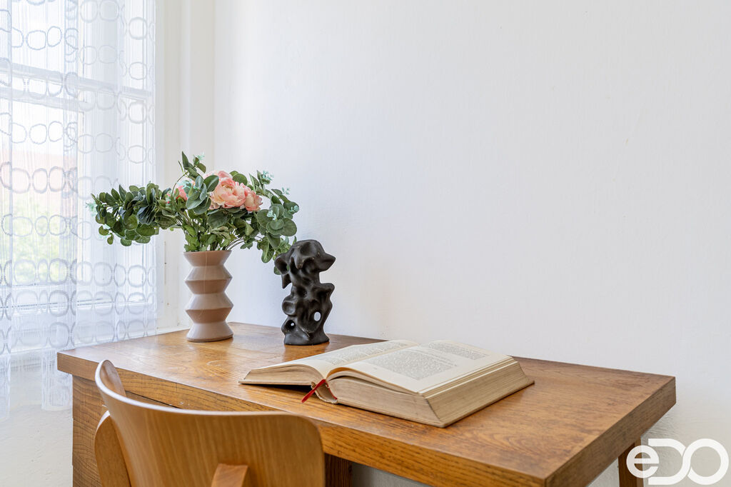 Dispozice: po vstupu do předsíně je vpravo samostatné WC. Dále chodbou vpravo kuchyně s velkou spižírnou. Na konci chodby vstup do ložnice, vlevo do obývacího pokoje. Mezi ložnicí a kuchyní je menší místnost využívaná jako pracovna, z níž je přístupná koupelna. Tyto dva prostory odděluje dřevěná příčka; v Prohlášení vlastníka jsou vedeny společně jako „lázně“. K bytu náleží velmi prostorný sklep v suterénu. Před domem je možnost rezidentního parkování. Za domem se nachází městský pozemek, který je nyní využíván jako oplocená společná zahrada.