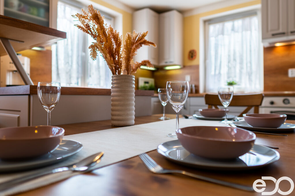 Přízemí – prostorný obývací pokoj s kuchyňským koutem (plně vybavená kuchyňská linka, orientace J/Z), přístup na krytou terasu přes francouzské okno, pracovna/posilovna, koupelna se sprchovým koutem a technickým zázemím, samostatné WC, vstupní chodba, úložný prostor pod schodištěm.