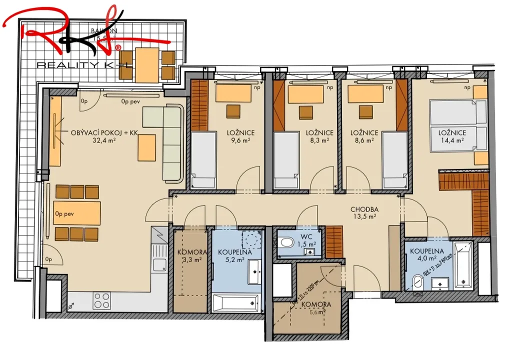 Vnitřní dispozice: Vstupní chodba kde se nachází vstup do obývacího pokoje spojeného s kuchyňským koutem, který nabízí přímí vstup na balkón. Hlavní ložnice má šatnu a plně vybavenou koupelnu. Dále z chodby je vstup do koupelny s vanou. Toaleta. Tři pokoje. Komora. Koupelny v ceně, plně zařízené, obložkové dveře. Kuchyň a podlahy nejsou součastí prodeje, dotace na podlahovou krytinu.