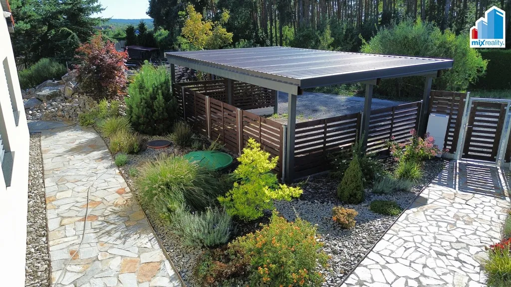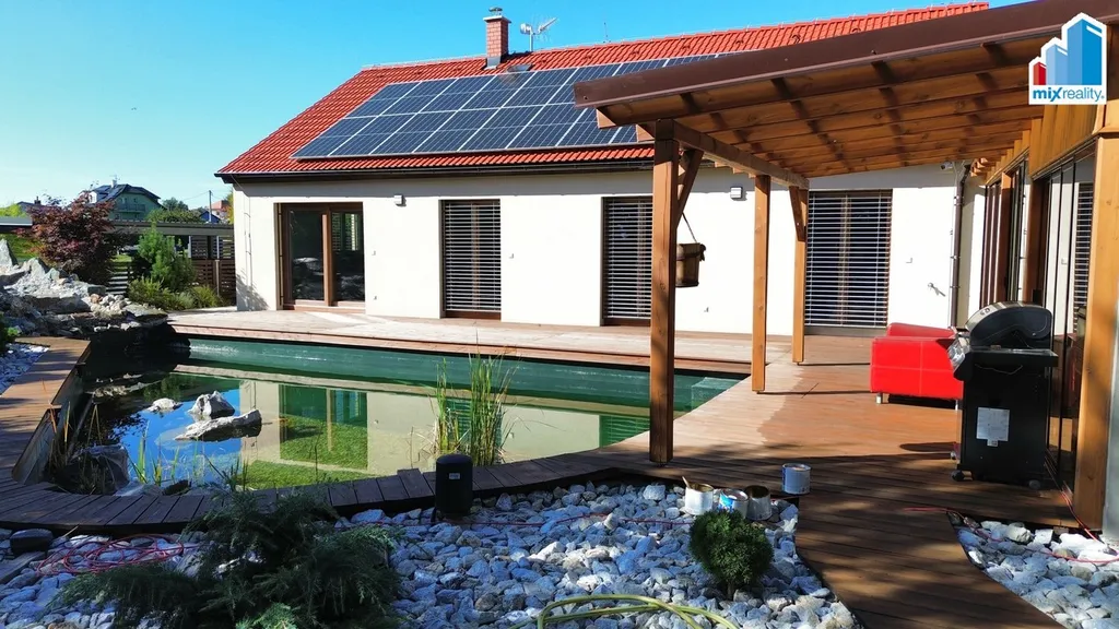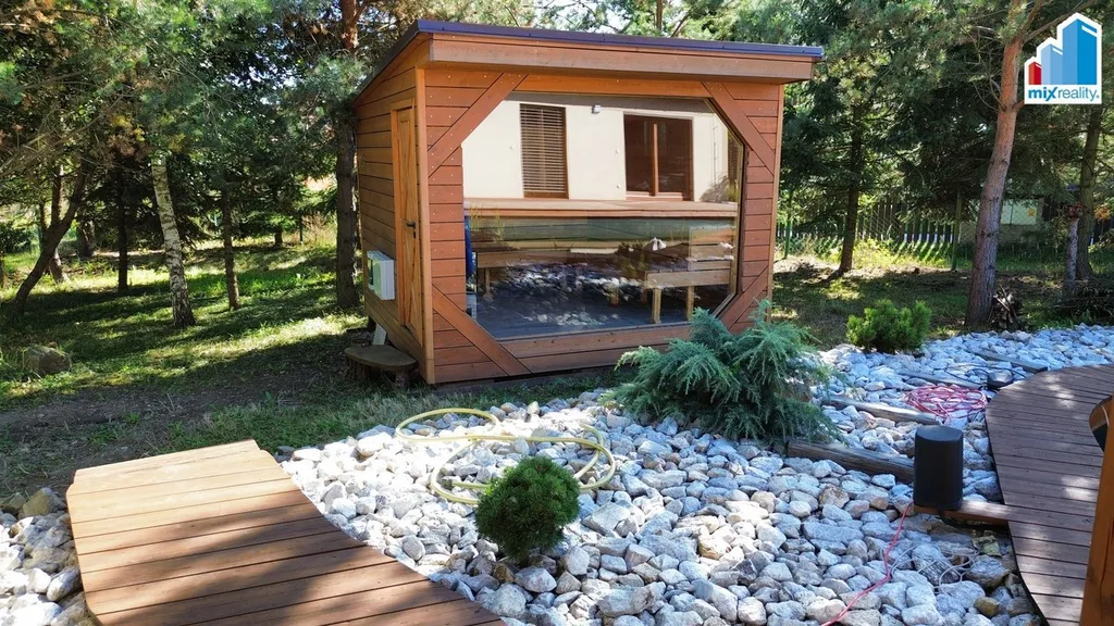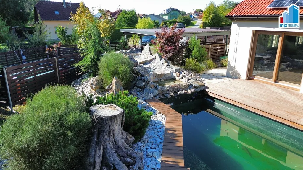 Součástí exteriéru je wellness zóna s kvalitní vířivkou, posilovnou a samostatnou finskou saunou. Na pozemku se dále nachází přírodní koupací jezírko o ploše 50 m² s vlastní čističkou vody, zahrádka se zvýšenými záhony, plechová garáž a zastřešené parkovací stání pro dva automobily. Celý pozemek je oplocen a nabízí maximální soukromí i bezpečí.