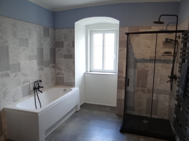 • velké koupelny (12,6 m²) vybavené vanou, sprchovým koutem, WC, umyvadlem, designovým radiátorem a průtokovým bojlerem,