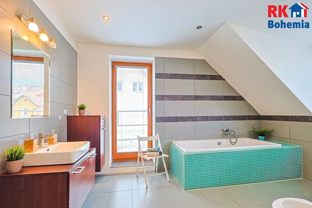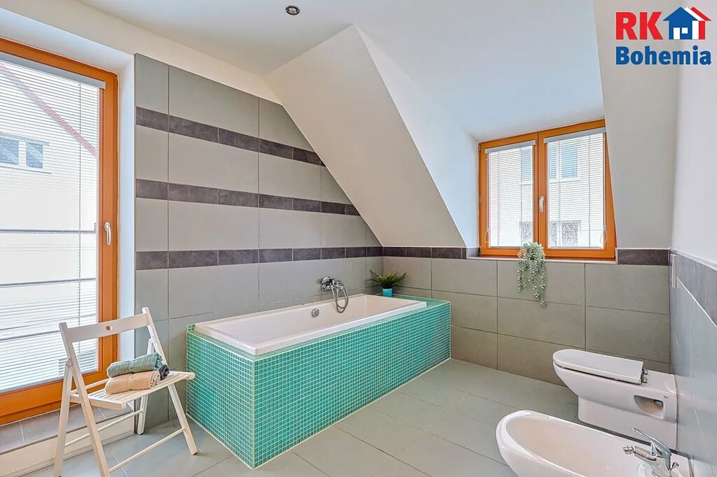 V koupelně v 1.NP se nachází sprchový kout, umyvadlo se skříňkou a WC. Ve 2.NP je vana, umyvadlo se skříňkou, WC a bidet.