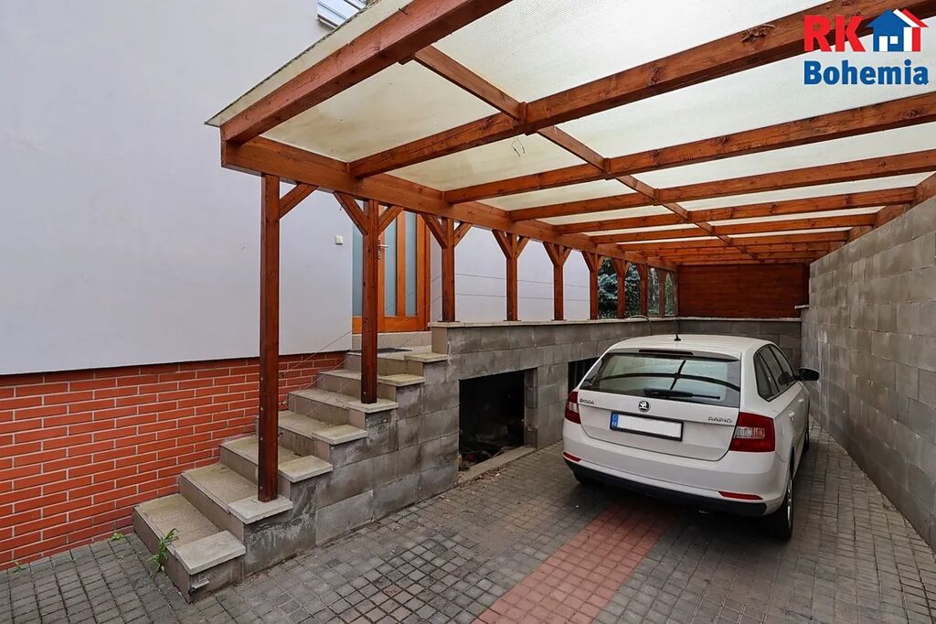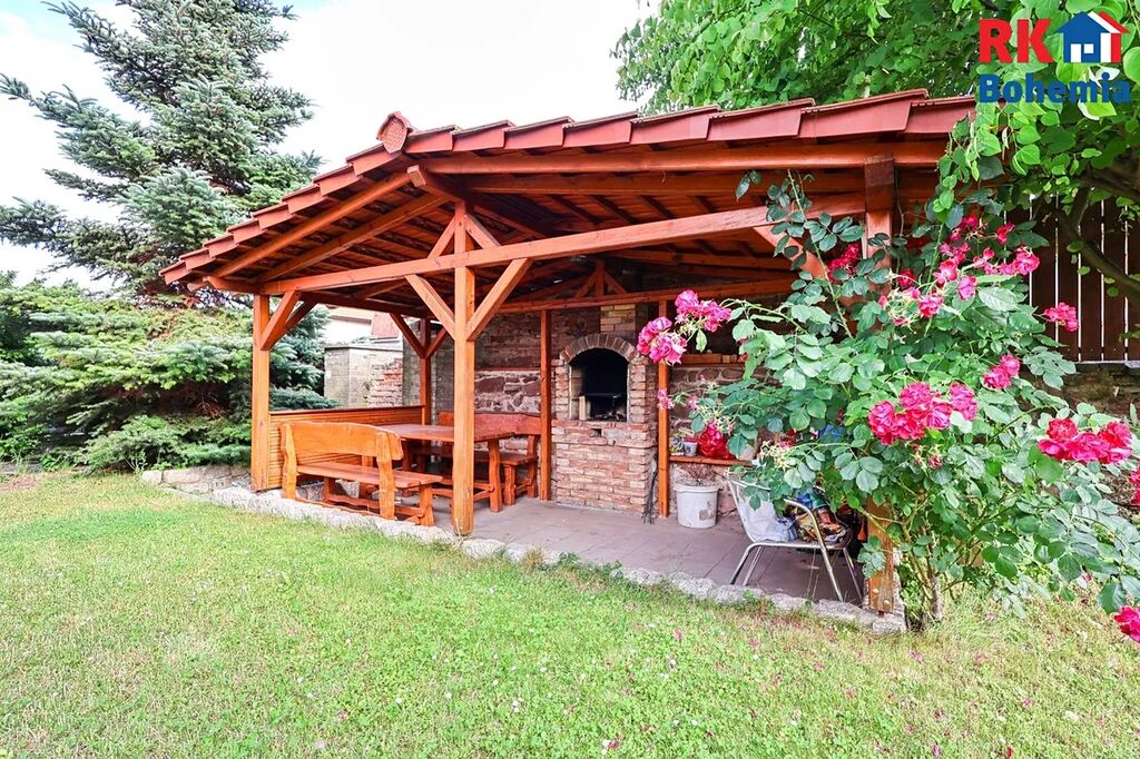 Na pozemku, který je celý oplocený, se nachází dřevěná pergola s krbem a kryté parkovací stání. Vzrostlé jehličnaté a listnaté dřeviny a keře vybízí k relaxaci a odpočinku.