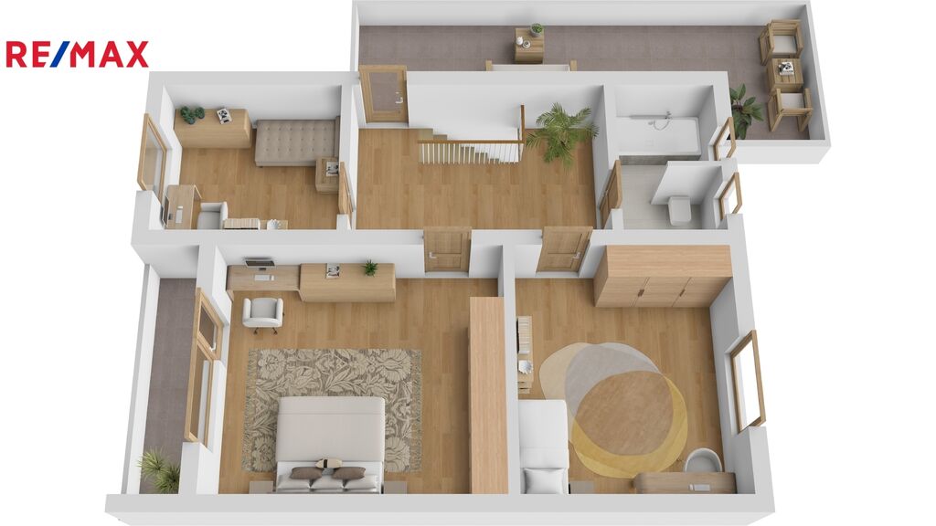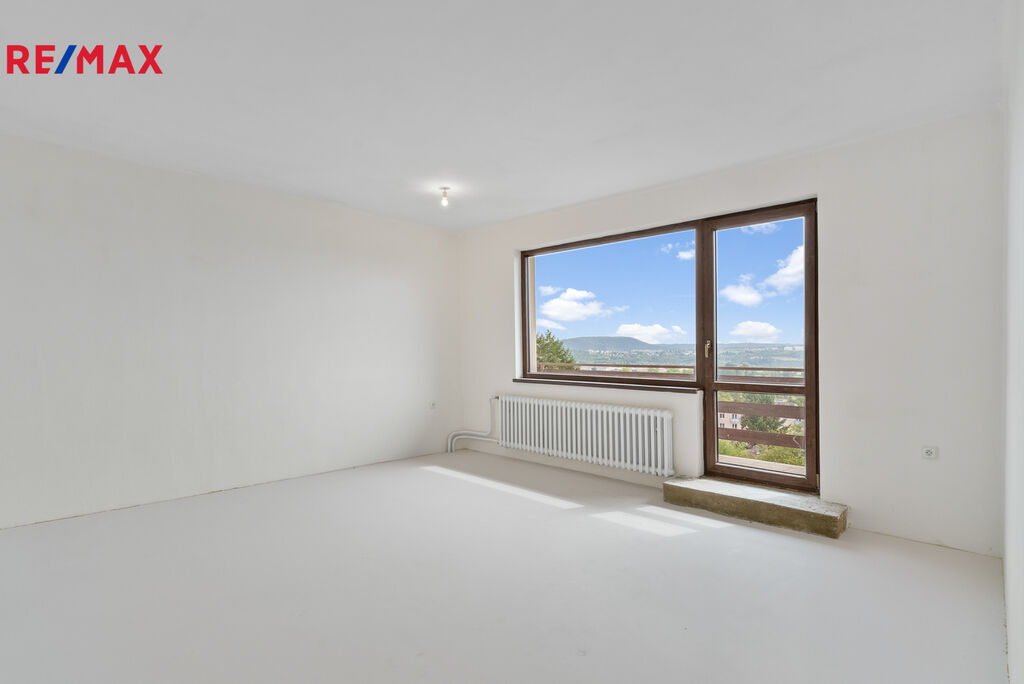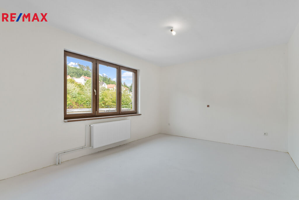 První jednotka se rozkládá ve dvou podlažích – v přízemí najdeme velký obývací pokoj s krbem a balkonem, kuchyň se spižírnou a novou koupelnu. V patře pak tři ložnice a koupelnu s vanou. Nechybí ani velká rohová terasa, která nabízí panoramatické výhledy na Radotín a řeku Berounku.