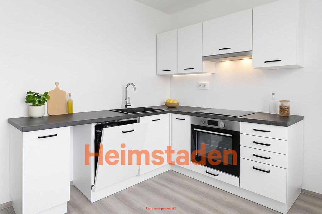 Byt vás potěší novou rohovou kuchyňskou linkou, která je vybavena myčkou, elektrickou troubou a varnou deskou.