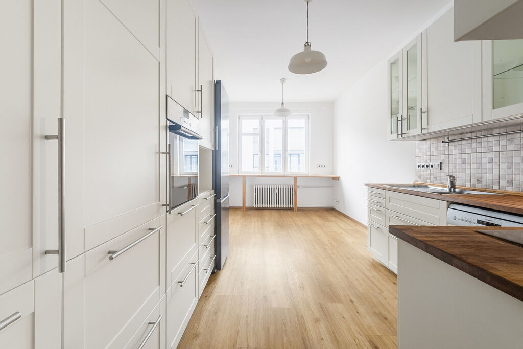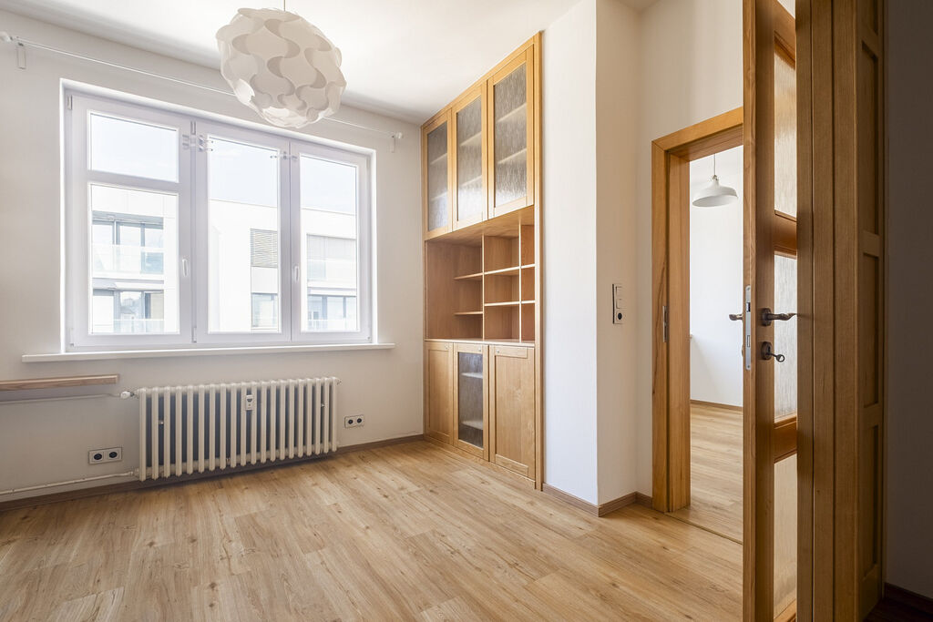 Exkluzivní nabídka družstevního bytu, který prošel kompletní rekonstrukcí. Byt se nachází ve 4.patře cihlového domu. Dům se nachází jen pár kroků od metra Palmovka. Samotný byt má 76 m², sklepní koje v suterénu domu má cca 2 m². Byt byl architektem upraven na chytře řešené 3+1 s prostorným dětským pokojem a 2 WC. Chodba je dostatečně široká, takže je zde prostor, pro umístění skříně či polic. Na podlahách kvalitní vinylová podlahová krytina. Dveře a zárubně jsou z jasanového masivu, rovněž tak jsou z jasanu vyrobené i šikovně řešené úložné prostory v obývacím pokoji. Centrální vytápění bytu. Ohřev teplé vody zajišťuje el. boiler. Na bytě vázne nesplacená anuita cca 610 tis., která se splácí v měsíčních poplatcích. Bytové družstvo v loňském roce provedlo zateplení střechy, což zlepšilo tepelný komfort v bytě. BD má příjem z pronájmu pozemku pro výdejní boxy.