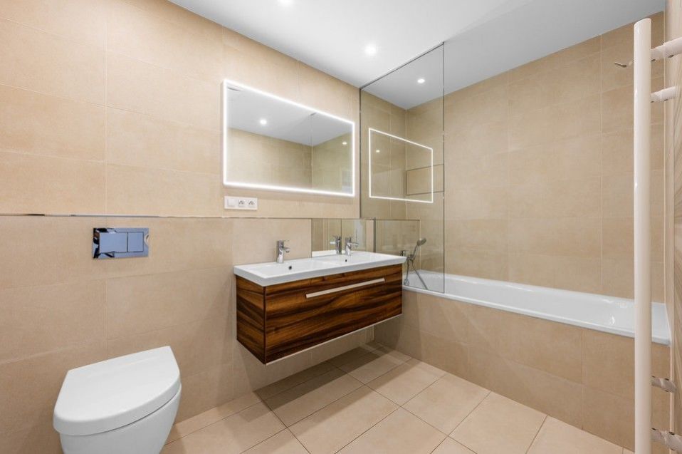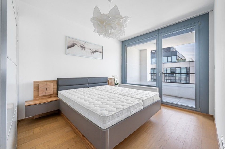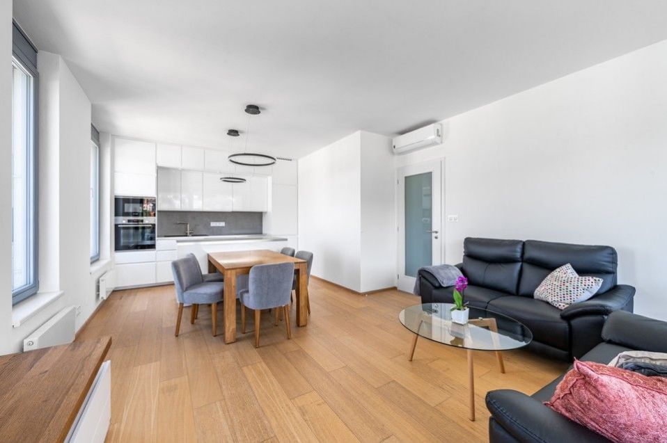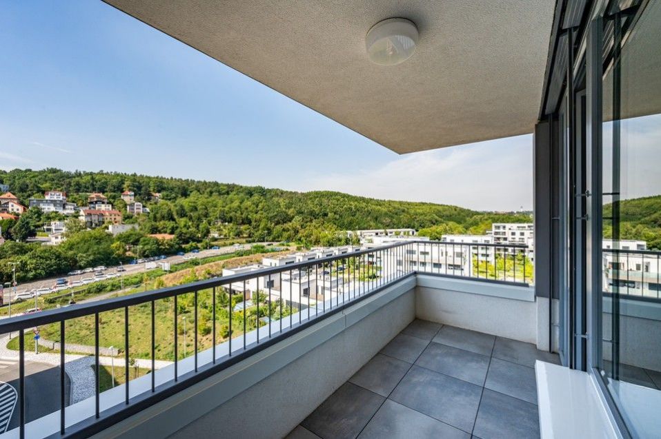Pronájem slunného, moderního, jihozápadně orientovaného, kompletně vybaveného, klimatizovaného bytu 4+kk (109m2) s krásnými protilehlými výhledy do okolní zeleně, se dvěma balkony (9,8m2) a parkovacím místem v ceně nájmu v 8.podlaží prestižní nízkoenergetické (A) bytové rezidenci Waltrovka s nízkými provozními náklady, umístěné na Praze 5, v pěší dostupnosti stanice metra Jinonice (linka B) a oblíbeného parku Cibulka.