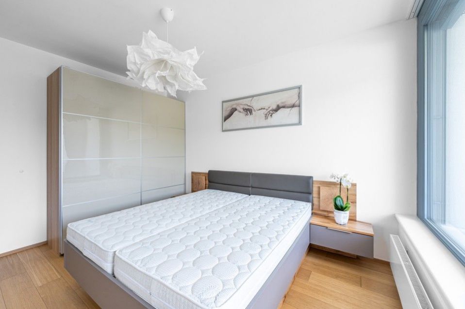 Nadstandartní vybavení zahrnuje kuchyňskou linku v bílém designu (myčka, lednice, mrazák, trouba, mikrovlnná trouba, indukční deska, podlahy z masivu, jídelní stůl, 6 čalouněných židlí, kožená sedací souprava, konferenční stolek, velkoplošná televize a skříňka pod televizi, vybavená ložnice - manželská postel, prostorná šatní skříń s posuvnými dveřmi, stropní osvětlení v celém bytě, pračka a sušička, dostatek úložných prostor - šatní skříně v chodbě.