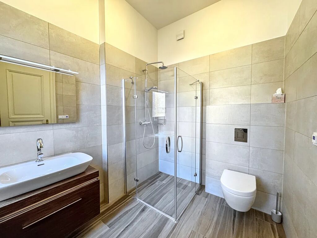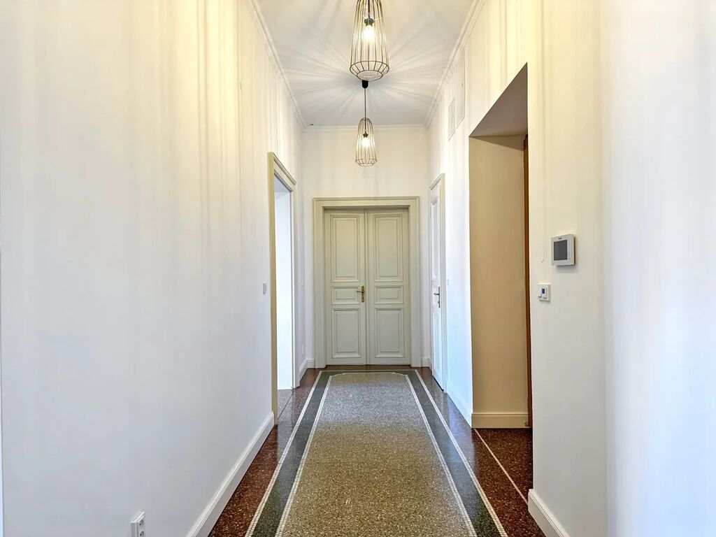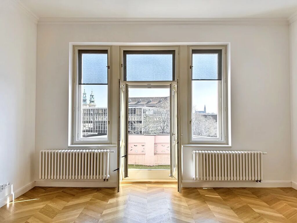 Byt se pyšní vysokými stropy, velkými okny a třemi balkony s nádherným výhledem na Emauzy a přilehlý park. Světlý interiér tvoří prostorný obývací pokoj s balkonem, plně vybavená kuchyň s dalším balkonem, hlavní ložnice s vlastní koupelnou (sprchový kout, toaleta) a balkonem, dvě další ložnice, samostatná koupelna s vanou, bidetem a toaletou, technická komora, toaleta pro hosty a velkorysá vstupní hala.