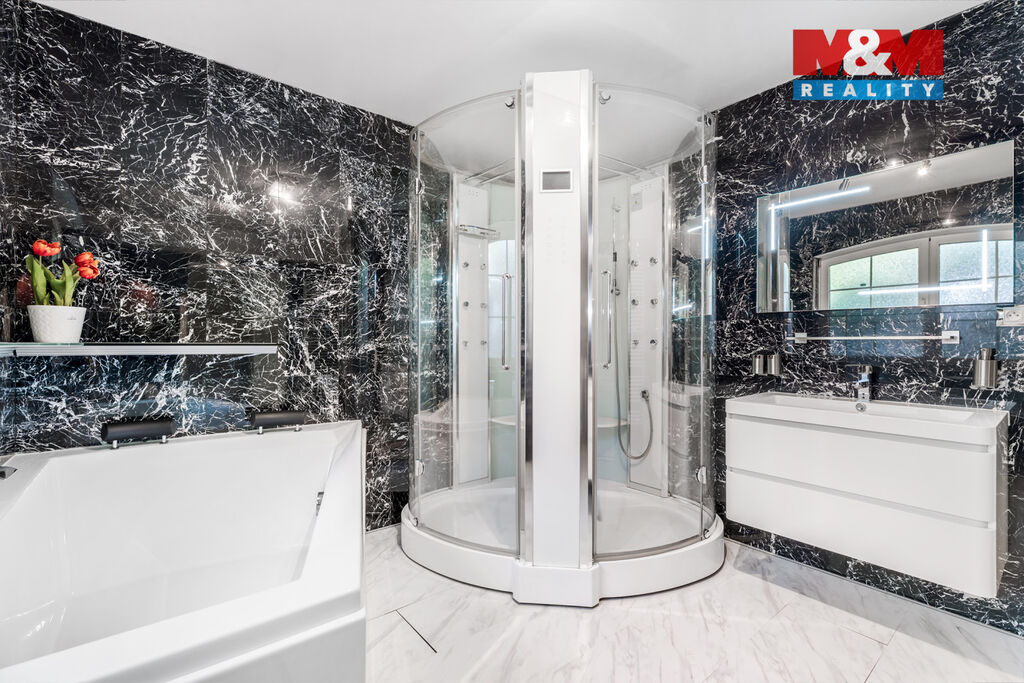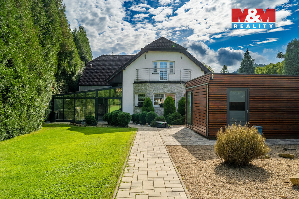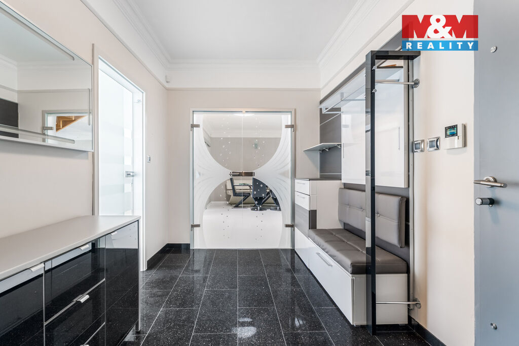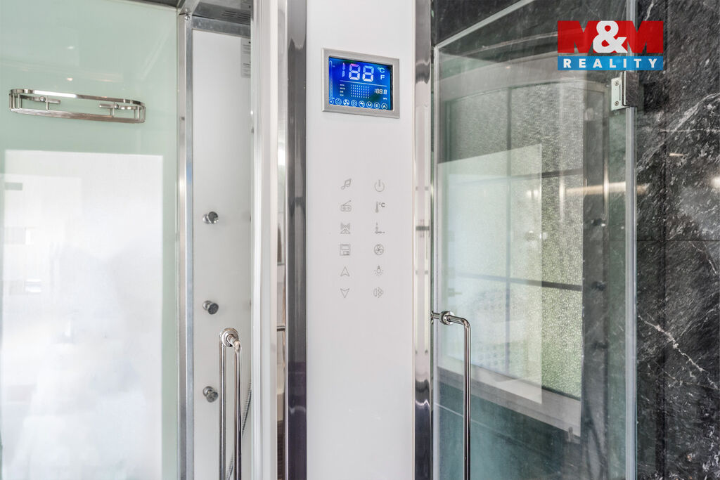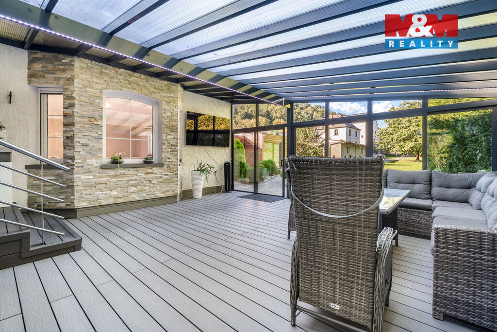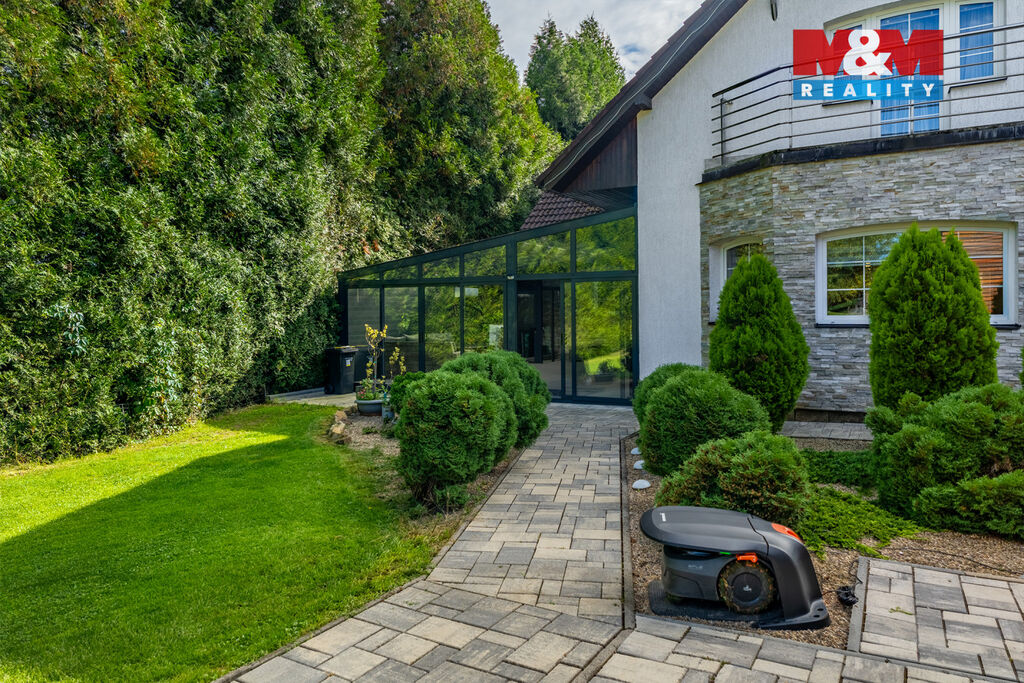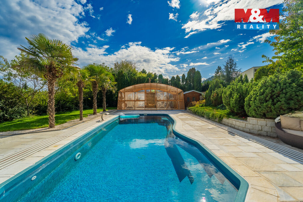 K prodeji nabízíme výjimečný rodinný dům 5+1 v Děčíně, ul. Veveří – část Václavov, který osloví náročné zájemce hledající nadstandardní bydlení s maximálním soukromím. Dům nabízí velkorysý obytný prostor s důrazem na komfort a moderní technologie. Krytý bazén 10×4 m lze díky tepelnému čerpadlu a hliníkovému zastřešení využívat celoročně, zadní terasa je osazena elektrickými roletami s LED podsvícením. V přízemí se nachází prostorný obývací pokoj s jídelnou a kuchyní se spotřebiči značek Siemens a Miele, pracovna a koupelna s designovou vanou z litého černého mramoru a sprchovým koutem EAGO. Podlahy z přírodního kamene jsou zde vyhřívané. V patře jsou tři pokoje, další komfortní koupelna se sprchou a klimatizace, která zajišťuje pohodlí v letních měsících. K zázemí náleží zasklená pergola s klimatizací, garáž a dvě samostatné dřevostavby. Bezpečnostní dveře na otisk prstu, solární elektrárna s battery boxem i celkové technické řešení podtrhují jedinečnost této nabídky v blízkosti centra