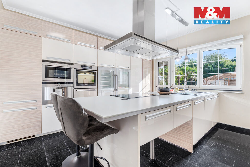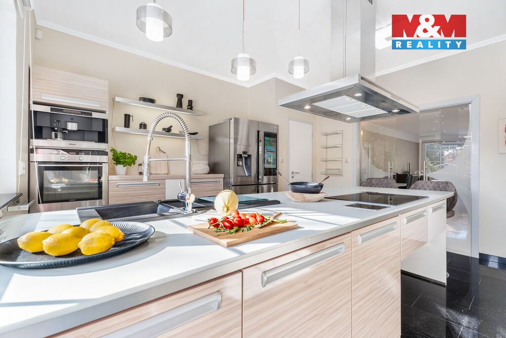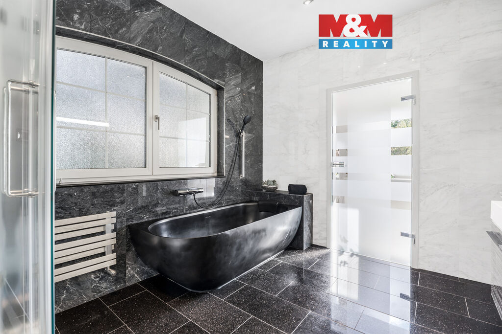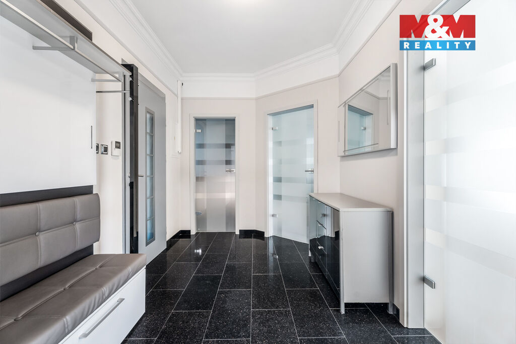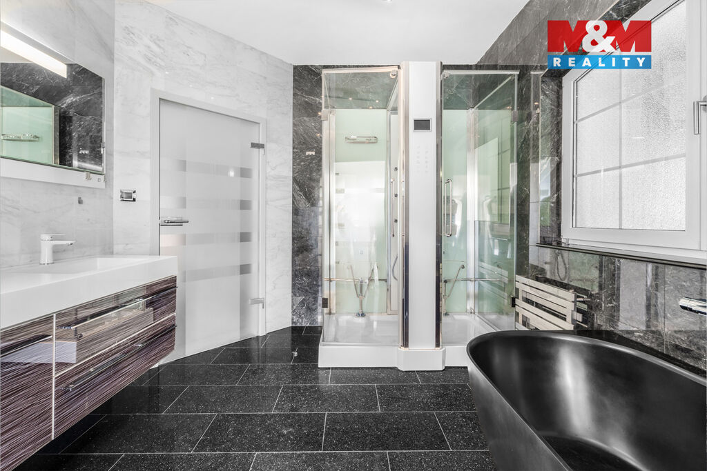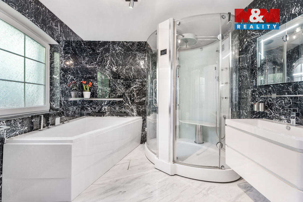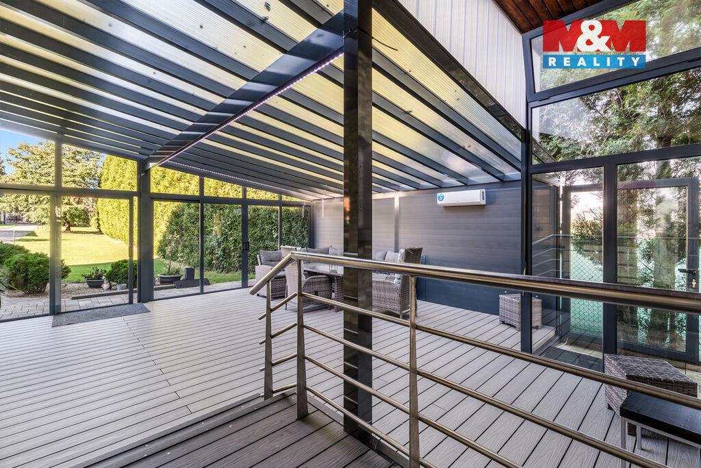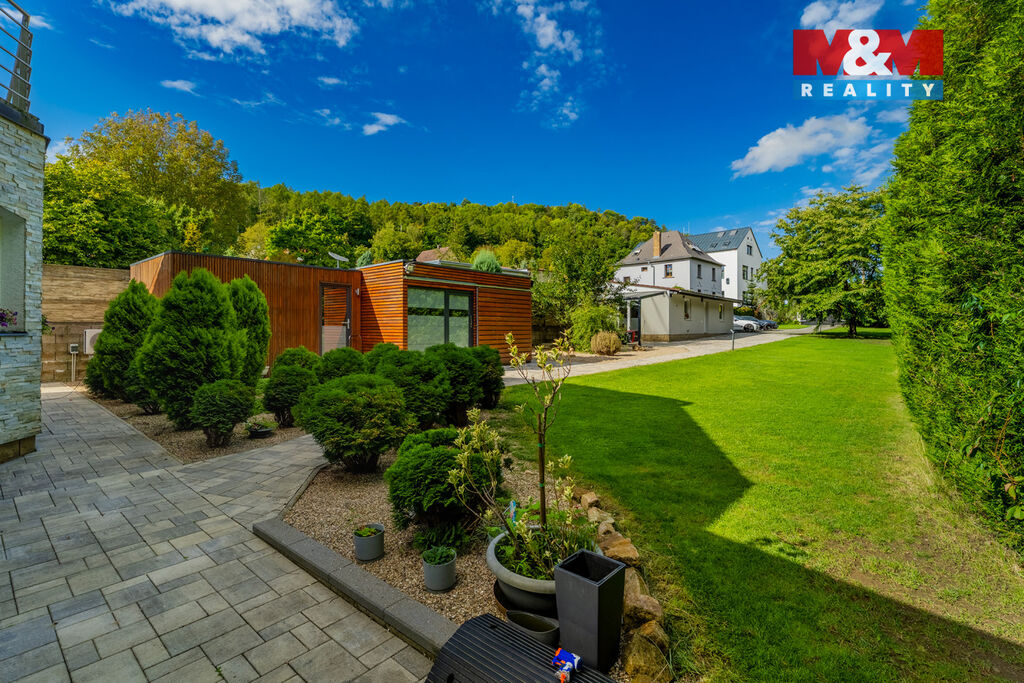 K prodeji nabízíme výjimečný rodinný dům 5+1 v Děčíně, ul. Veveří – část Václavov, který osloví náročné zájemce hledající nadstandardní bydlení s maximálním soukromím. Dům nabízí velkorysý obytný prostor s důrazem na komfort a moderní technologie. Krytý bazén 10×4 m lze díky tepelnému čerpadlu a hliníkovému zastřešení využívat celoročně, zadní terasa je osazena elektrickými roletami s LED podsvícením. V přízemí se nachází prostorný obývací pokoj s jídelnou a kuchyní se spotřebiči značek Siemens a Miele, pracovna a koupelna s designovou vanou z litého černého mramoru a sprchovým koutem EAGO. Podlahy z přírodního kamene jsou zde vyhřívané. V patře jsou tři pokoje, další komfortní koupelna se sprchou a klimatizace, která zajišťuje pohodlí v letních měsících. K zázemí náleží zasklená pergola s klimatizací, garáž a dvě samostatné dřevostavby. Bezpečnostní dveře na otisk prstu, solární elektrárna s battery boxem i celkové technické řešení podtrhují jedinečnost této nabídky v blízkosti centra