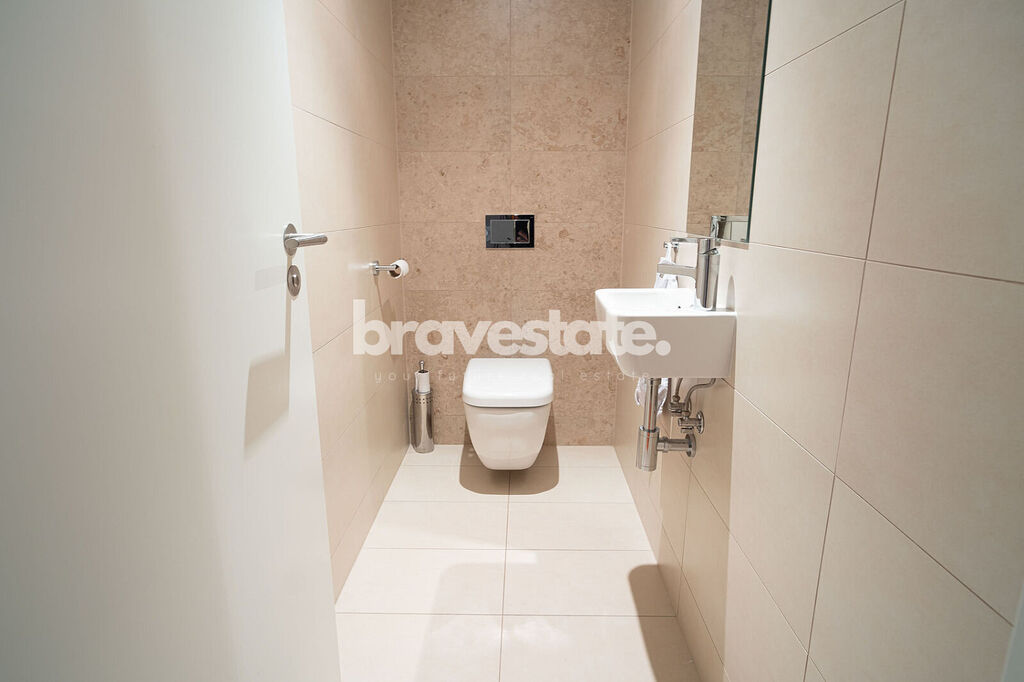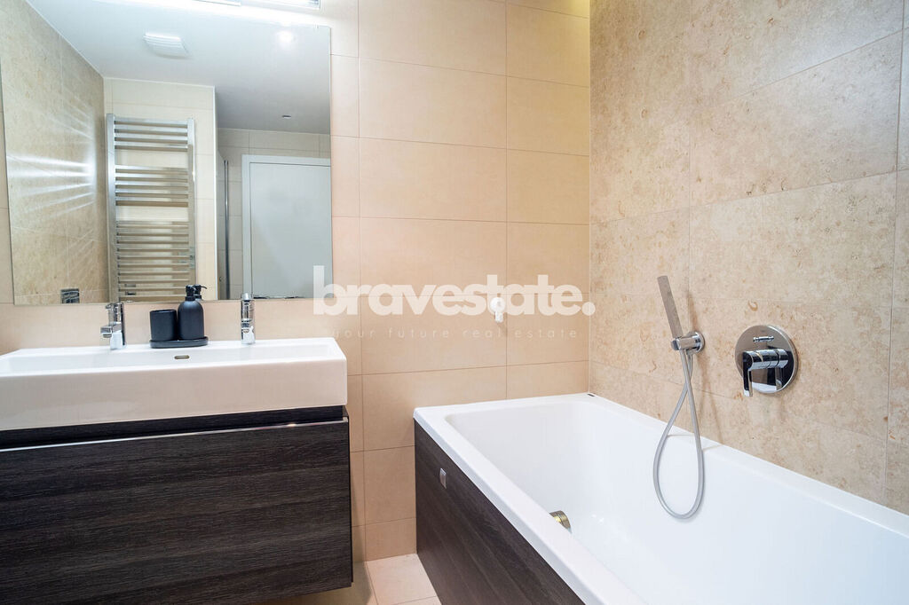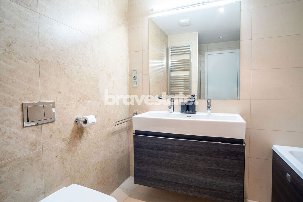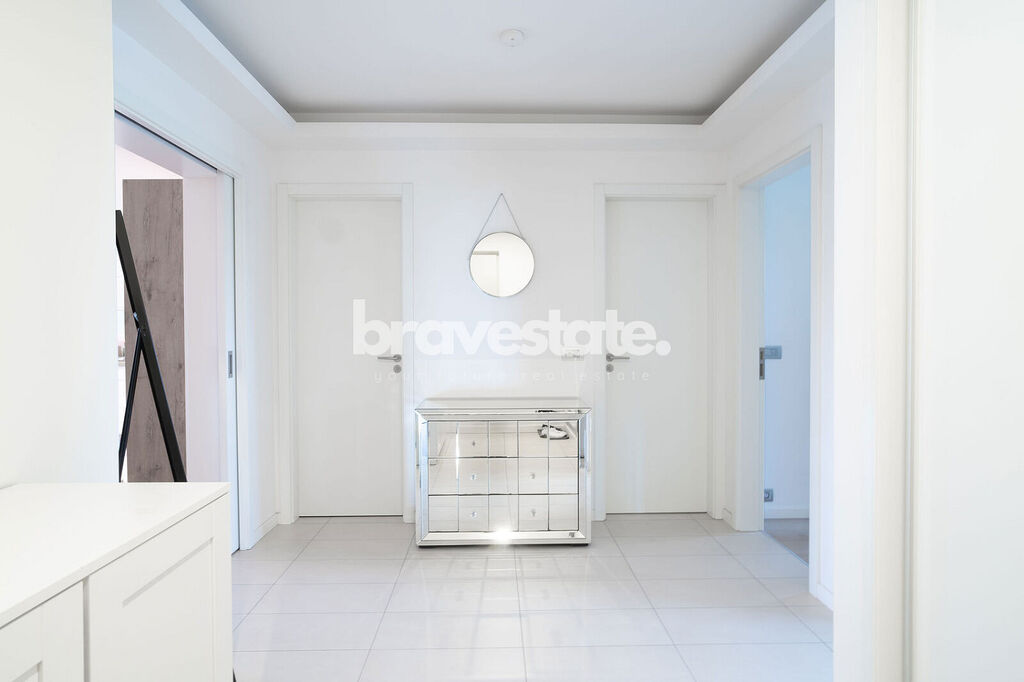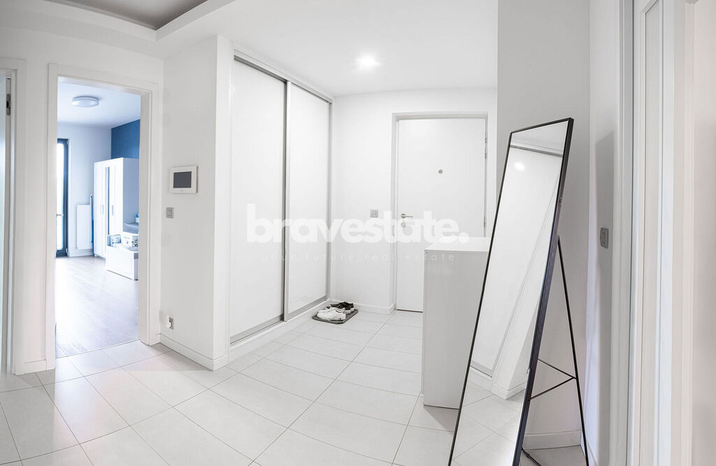 V bytové jednotce se nachází prostorná předsíň s vestavěnou skříní a separátní toaletou pro návštěvy. Dále obývací pokoj, který je propojen s kuchyní a odkud je přímý vstup na balkón s výhledem do zahrad Rezidence Dock a z části na Vltavu. Bytová jednotka taktéž nabízí dvě ložnice, které jsou vybaveny úložnými prostory. A koupelnu, která nabízí vanu se sprchovým koutem, toaletou a s dvěma umyvadly.