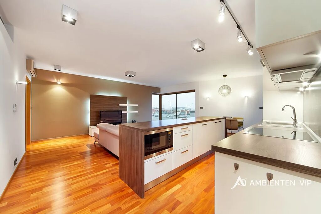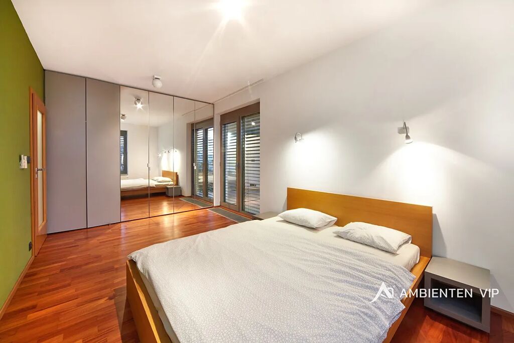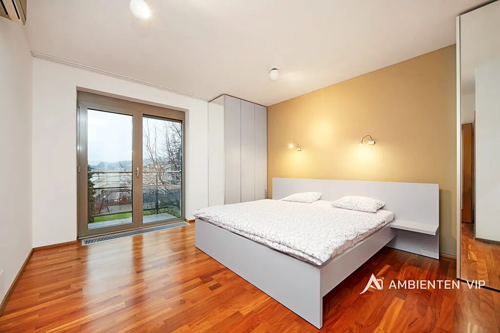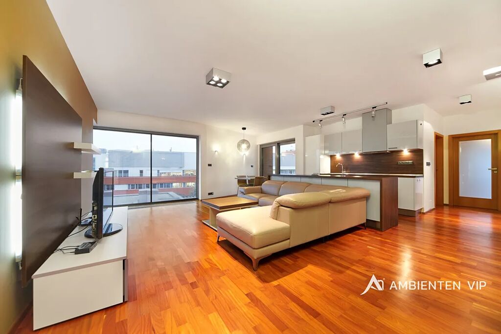 Prostorný byt o podlahové ploše 98,1 m2 s terasou o velikosti 9m2 a balkónem o velikosti 2m2 se nachází ve 3. patře moderní budovy s výtahem. Byt disponuje ložnicí a pokojem, dále prostorným kuchyňským koutem s obývacím prostorem o velikosti 36,8 m2, z kterého je přímý vstup na jižně orientovanou terasu s krásným panoramatickým výhledem. Všechny pokoje jsou vybaveny nábytkem. Nájemník se tak může nastěhovat pouze s osobními věcmi a může ihned bydlet.