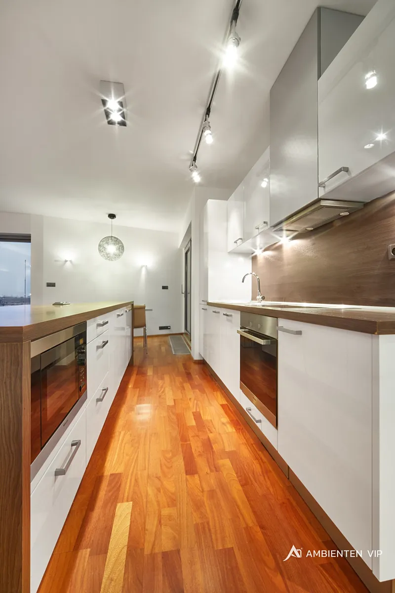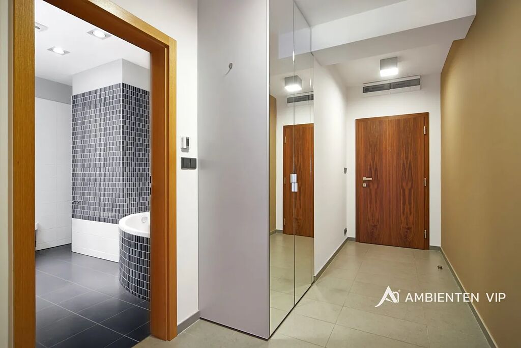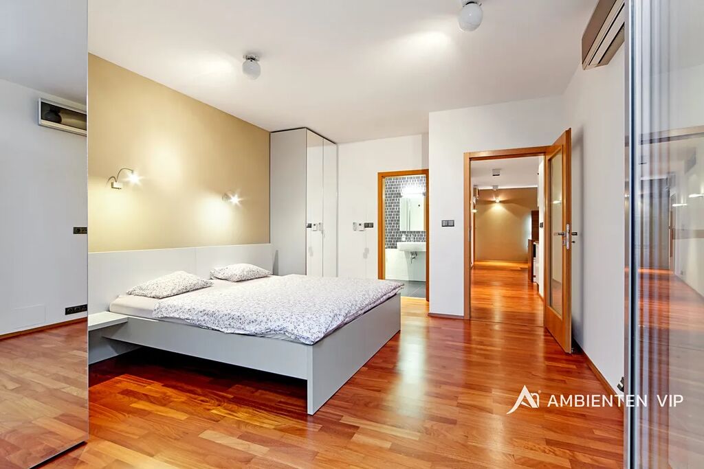 Vybavení bytu: moderní kuchyňská linka na míru s veškerými spotřebiči (varná deska, trouba, digestoř, mikrovlnná trouba, chladnička, myčka nádobí), pračka, vestavěné skříně, postele, obývací stěna, televizor, sedací souprava, konferenční stolek, světla, dřevěné dveře a podlahy, venkovní elektrické žaluzie a klimatizace.