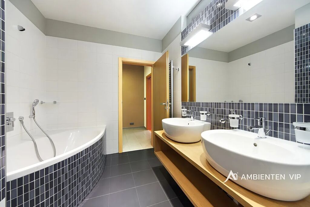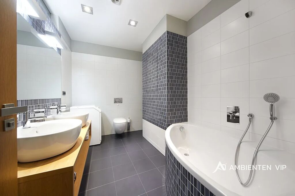 Koupelna je vybavena vanou, sprchovým koutem, umyvadlem, WC a je zde také pračka. Druhá koupelna je přímo k ložnici.