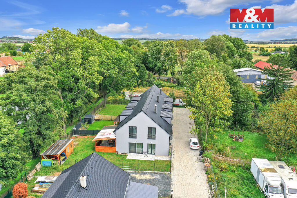 Nabízíme k prodeji moderní rodinný dům v klidné části obce Vykáň. Jedná se o rohovou část řadového dvoupodlažního domu, kolaudovaného v roce 2023. Dispozice 4+kk zahrnuje prostorný obývací pokoj s kuchyňským koutem, krbovými kamny a přímým vstupem na krytou terasu 28 m². V přízemí dále najdete chodbu, komoru, samostatné WC a technickou místnost. V patře se nachází tři ložnice, šatna a koupelna s bidetem, vanou, dvěma umyvadly a sprchovým koutem. Nad celým domem je pochozí půdní prostor, který slouží jako praktické úložné místo. Součástí pozemku 452 m² je nekrytá terasa 10 m², zahradní domek 9 m² s přístřeškem 9 m², dřevník u terasy a sklad 6 m² s vchodem vedle hlavního vstupu. Celý pozemek je oplocen a nabízí dostatek soukromí. Neváhejte a přijďte si prohlédnout tuto novostavbu, která čeká na svého nového majitele! Na návsi najdete úřad, obchod, autobusové spojení, a v budoucnu zde vznikne i školka. Autem je veškerá občanská vybavenost dostupná do 5 minut.