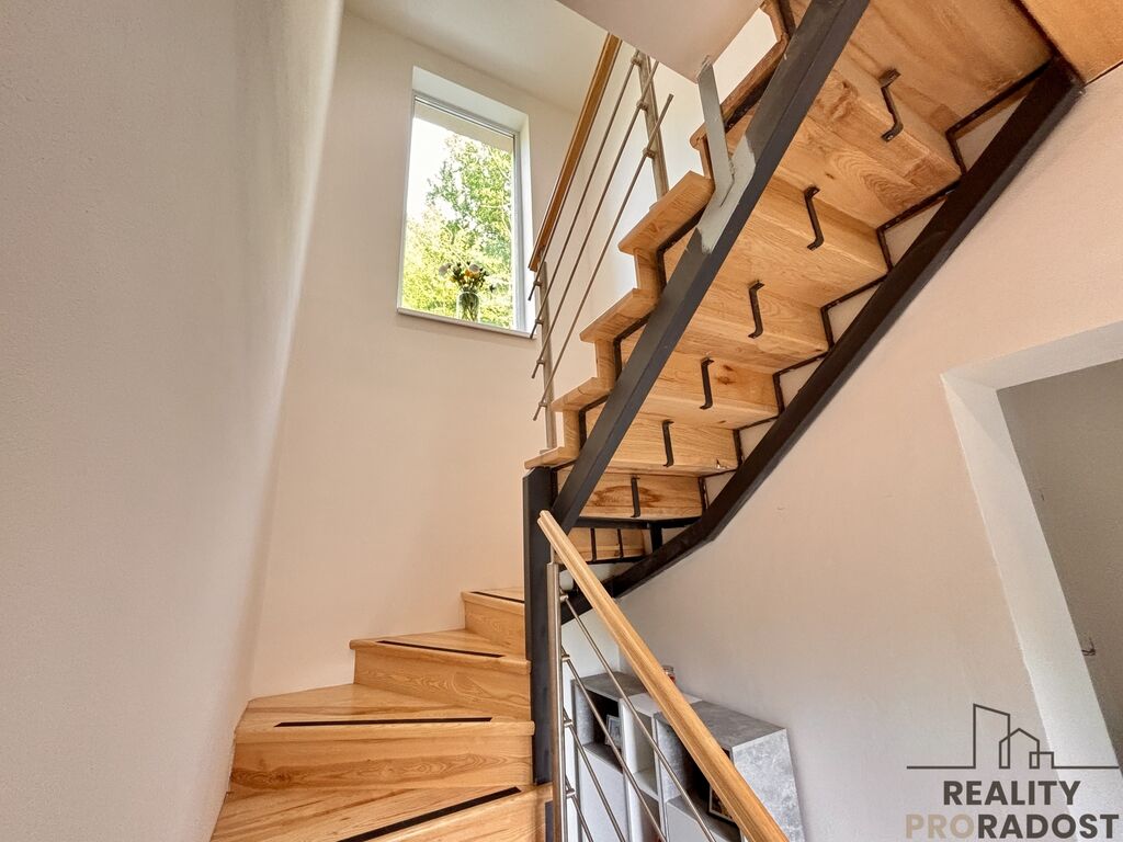 1. NP: vstupní chodba s odkládacím prostorem, úložný prostor pod schodištěm, obývací pokoj s jídelnou a kuchyní, samostatná toaleta, technická místnost na pračku a sušičku, prostorná koupelna s vanou.