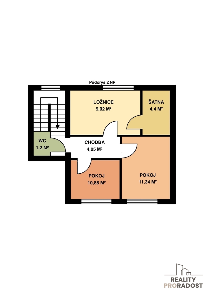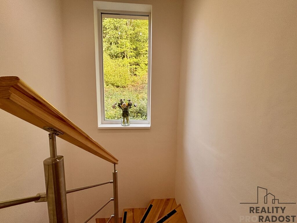 2. NP: dvě ložnice situované do zahrady, další ložnice s prostornou šatnou situovaná směrem do lesa . Na chodbě se nachází samostatná toaleta s umývátkem.