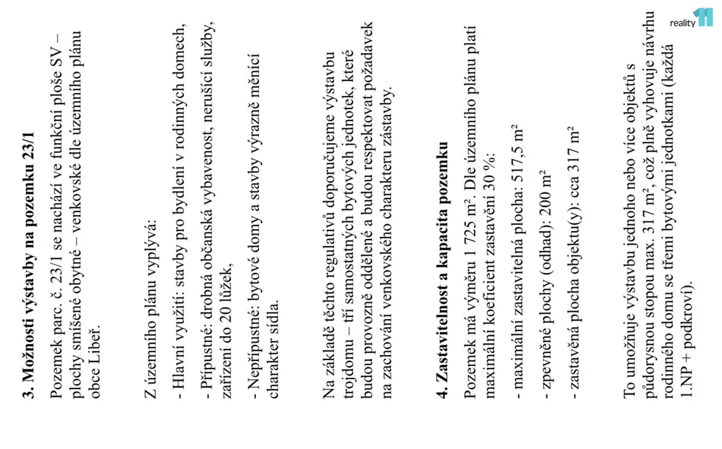 Již máme vypracovanou studii pro výstavbu rodinného domu o třech bytových jednotkách, ale je dle územního plánu možnost stavby pro bydlení v rodinných domech, možná drobná občanská vybavenost, nerušící služby, zařízení do 20-ti lůžek, nepřípustné jsou bytové domy.