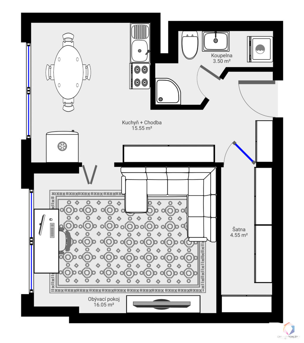 Dispozice zahrnuje samostatný pokoj, kuchyň s prostorem na jídelní kout, prostornou šatnu, kterou je možné využít i jako komoru nebo menší pracovnu, koupelnu se sprchovým koutem a WC.