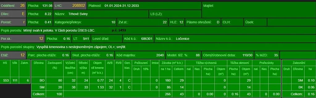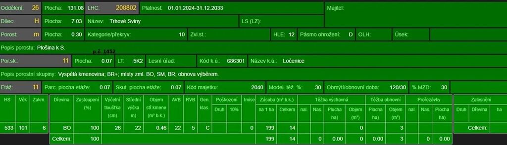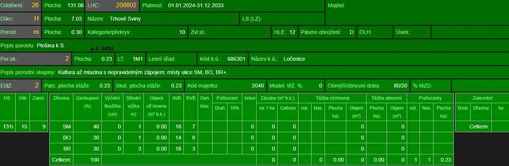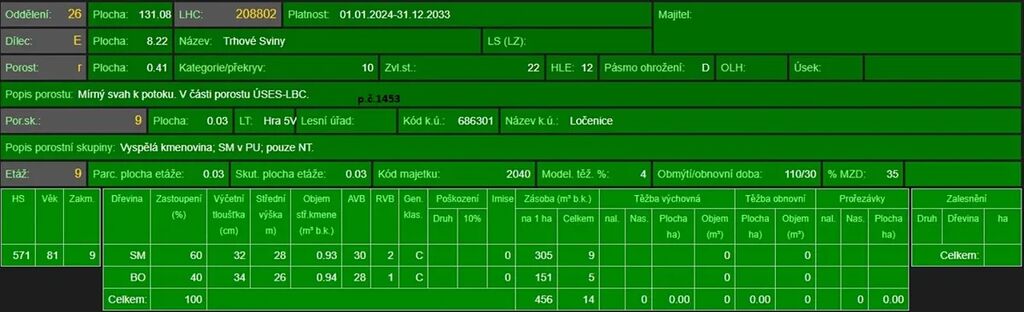 Jedná se o p.č.1452 vedená jako lesní pozemek o celkové výměře 3068 m2, stáří lesa 14 a 100 let, hlavní zastoupení dřevin dle LHO smrk, borovice, bříza.