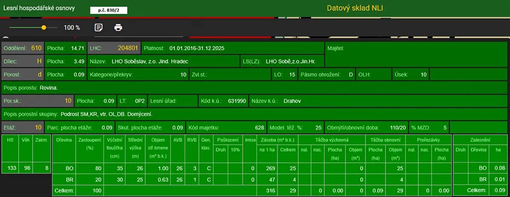 Dále p.č. 830/2 vedená jako lesní pozemek o celkové výměře 904 m2, vlastníme podíl 3/4 tudíž 678 m2.