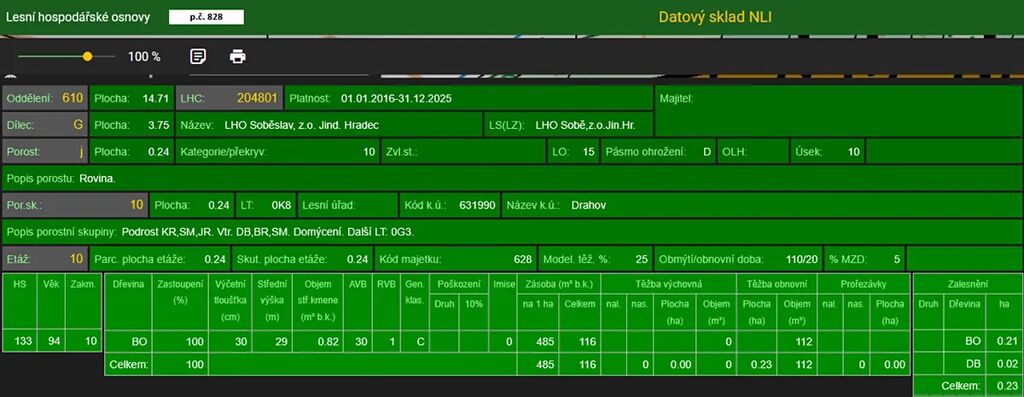 Jedná se o p.č. 828 vedená jako lesní pozemek o celkové výměře 2 349 m2, vlastníme podíl 3/4 tudíž 1 762 m2.
