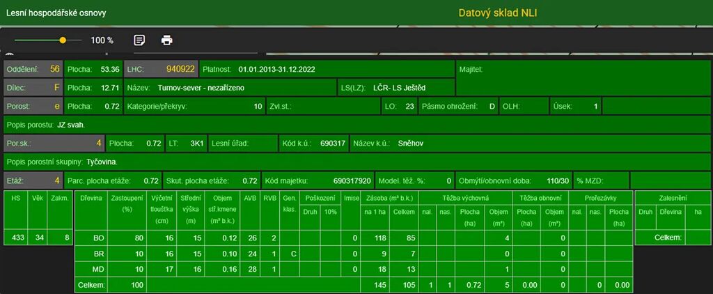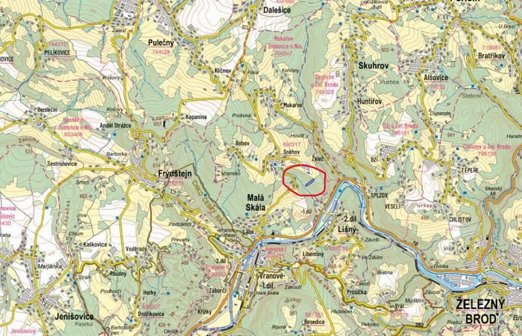 Jedná se o parcelu č. 1100/5 vedená jako lesní pozemek s celkovou výměrou 7 163 m2, vlastníme podíl 1/2, tedy 3 581 m2.