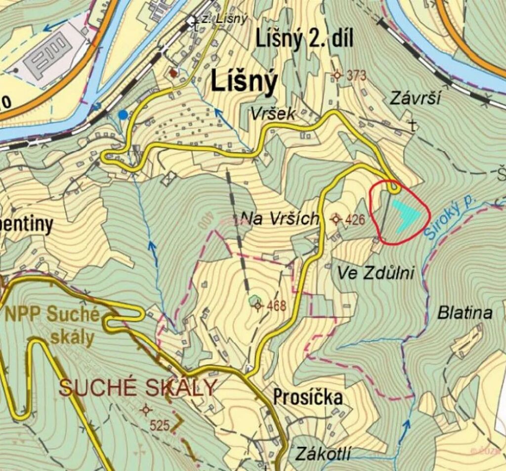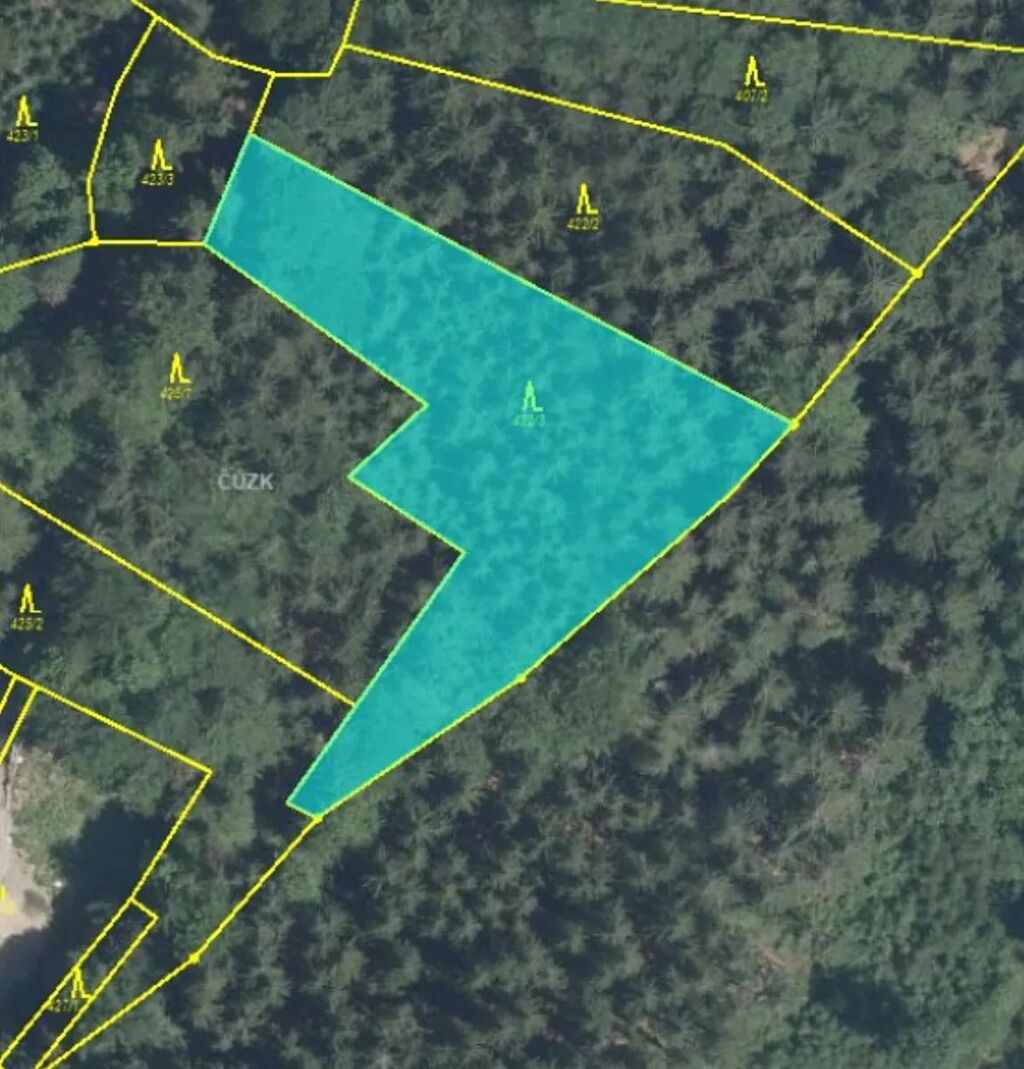 Jedná se o p.č. 422/3 vedená jako lesní pozemek o celkové výměře 3 140 m2, vlastníme 1/3 podílu tedy 1 047 m2.