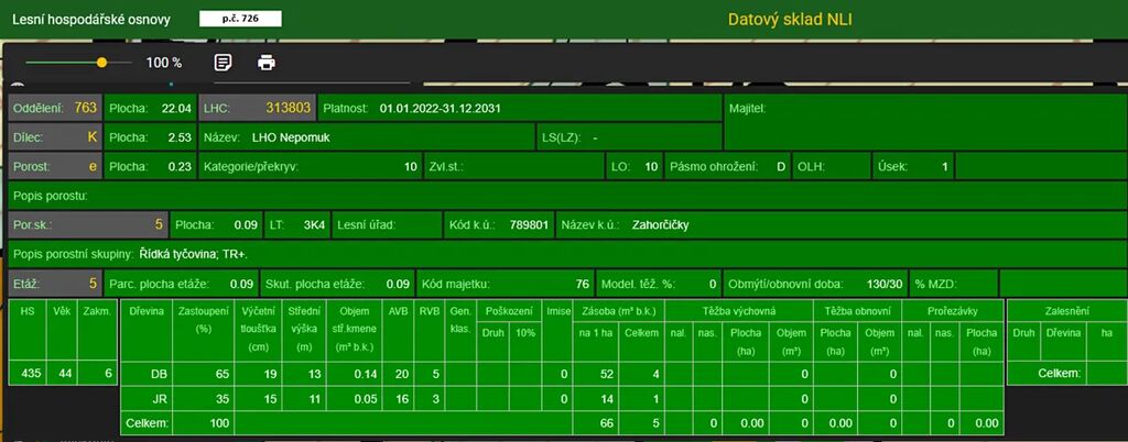 Dále se jedná o p.č. 726 vedená jako lesní pozemek o celkové výměře 2 271 m2, vlastníme podíl 2/9 tudíž 505 m2.