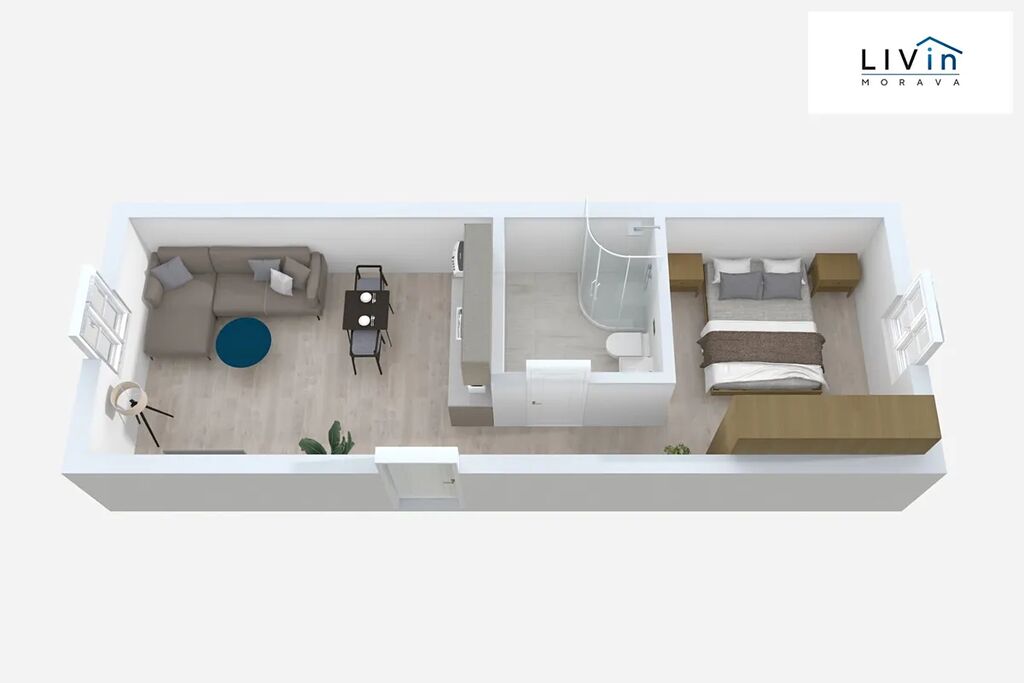 Byt dispozičně obsahuje dvě obytné místnosti, kuchyň a koupelnu spojenou s WC.