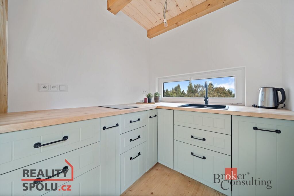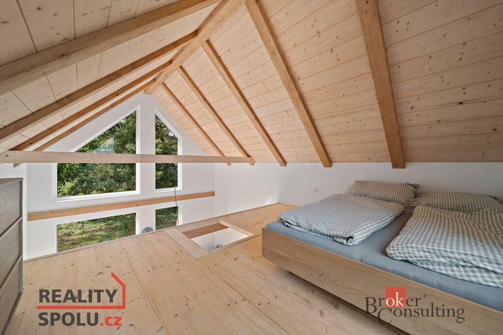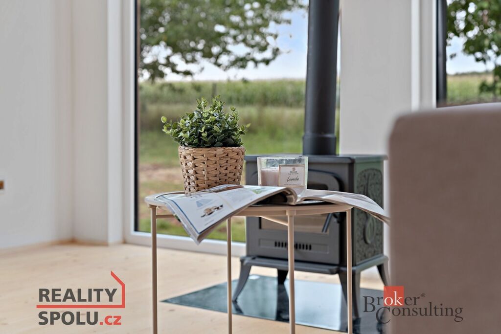 V přízemí se nachází koupelna, kuchyňský kout a útulný obývací prostor s krbem. Otevřený loftový prostor pokračuje do patra, kde je umístěné spaní. Atmosféru doplňuje venkovní terasa ideální pro posezení a odpočinek.