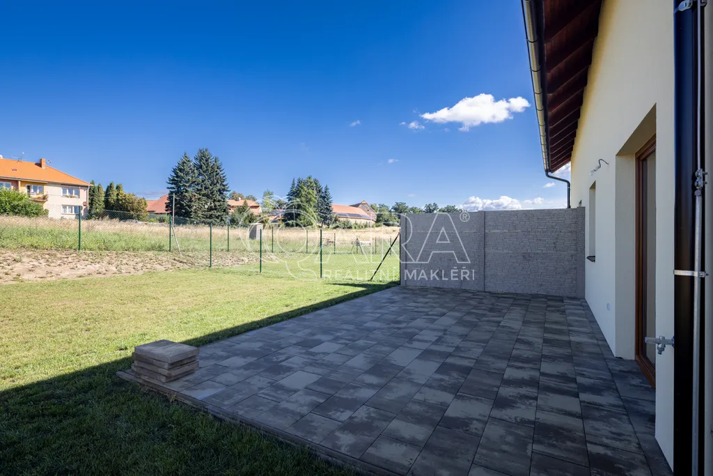 Dům je francouzským oknem v obývacím pokoji přirozeně propojen se zahradou o velikosti 239 m² (jedná se o čistou plochu zahrady ve které není započítána zastavěná plocha, parkoviště a prostor před domem), jejíž součástí je na dům navazující 28 m² vydlážděná terasa, díky jejíž severní orientaci si můžete venkovní prostor užít i v horké a slunné dny. Zahrada je kompletně oplocená, zatravněná a čeká na případné finální úpravy od nových majitelů. Akumulační nádrž (3 m3) pro budoucí hospodaření s dešťovou vodou je již na pozemku umístěna.