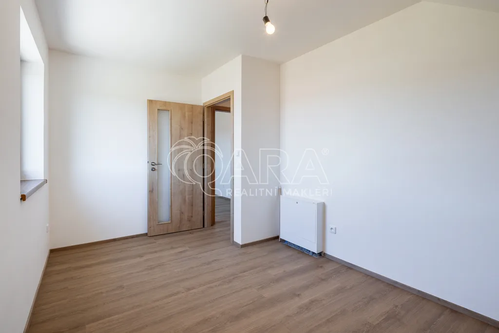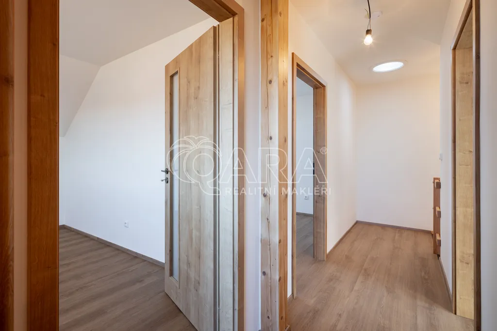 Dům o dvou podlažích (1. NP 54 m², 2. NP 50 m²) je dispozičně řešen jako 4+kk, přičemž v přízemí se nachází společenská zóna: obývací pokoj s kuchyňským koutem, předsíň, samostatné WC a technická místnost. V patře jsou tři samostatné ložnice a velkorysá koupelna se sprchovým koutem (v koupelně je také skrytá příprava pro vanu) a s WC. Téměř v celém domě je položena rigidní vinylová podlaha, v předsíni, technické místnosti a v koupelně je dlažba. V půdním prostoru je vytvořena pochozí půda o velikosti cca 25 m² k ukládání sezónních věcí.