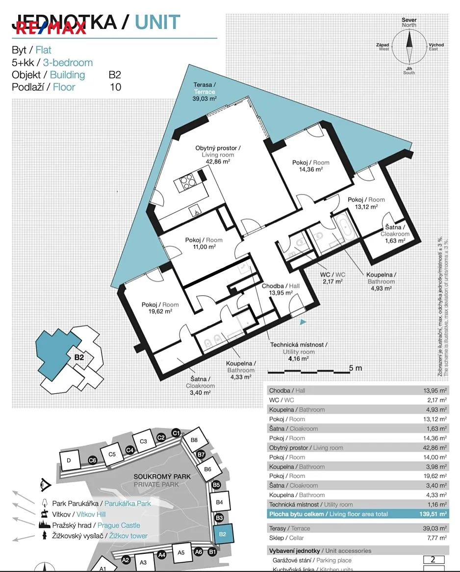 Byt se nachází v 10. patře uzavřeného rezidenčního komplexu s privátním parkem o rozloze 15 000 m². Tento jedinečný projekt nabízí veškerý komfort moderního bydlení: 24hodinovou recepci, ostrahu, bezpečné podzemní parkování, dětská hřiště, sportoviště i útulnou kavárnu přímo v areálu.