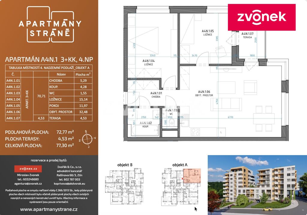 Nabízíme k pronájmu nový byt o dispozici 3+kk ve 4. nadzemním podlaží nově dokončeného bytového komplexu Byty Stráně. Byt má celkovou výměru 77,3 m² a skládá se ze vstupní chodby, dvou samostatných ložnic, prostorného obývacího pokoje s výstupem na terasu, kuchyňského koutu, samostatné toalety, koupelny s vanou a sklepa.