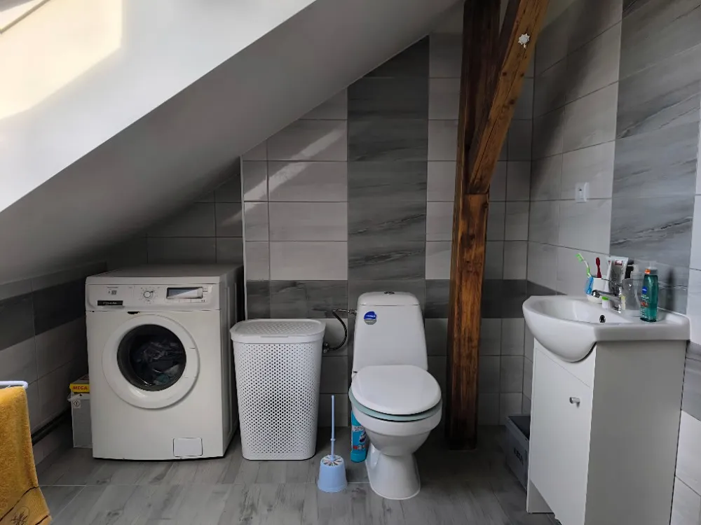 Nabízíme k prodeji novostavbu podkrovního bytu o dispozici 2+kk o podlahové ploše 69 m², který se nachází ve 2. patře bytového domu. Byt prošel kolaudací v roce 2021 a představuje tak moderní bydlení se zárukou kvality a nízkých provozních nákladů. Tato bytová jednotka byla navržena s důrazem na vysokou energetickou efektivitu a akustický komfort. Stěny i podlahy disponují nadstandardní 30cm izolací z vaty. Podlahy jsou tvořeny tlumicí kročejovou izolací (20mm), mirelonem a plovoucí podlahou, položenou na latích a dvou vrstvách OSB desek (25 mm). K dobré izolaci přispívají také třískelná střešní okna. Vstupní zeď do bytu tvoří masivní 30cm Ytong. Příčky v bytě jsou sádrokartonové. Bezpečnost zajišťují protipožární kovové vstupní dveře. Vytápění je řešeno elektrokotlem s radiátory, který je možné doplnit krbovými kamny. Do domu je zaveden také plyn. Pravidelné měsíční náklady - fond oprav 1000,-Kč/měs., zálohy na elektřinu 3700,-Kč/měs., voda1000,-Kč/měs. Dům je po částečné revitalizaci. Byly vybudovány nové odpadní stoupačky. V roce 2020 byla udělána nová střecha s betonovou taškou, novými svody a kominickou lávkou. Společenství vlastníků má v dohledném časovém horizontu v plánu zateplení fasády celého bytového domu. K bytu náleží prostorný sklep o velikosti 8–10 m². Velkou výhodou je možnost užívání pozemku u domu (zahrady). Pro bezproblémový příjem signálu je k dispozici společná TV anténa (pro 3 byty) a internet O2/pevná linka. Parkování je komfortně vyřešeno, k dispozici jsou až 4 parkovací místa přímo u domu. Schodiště do patra je kovové s dřevěnými nášlapy. Město Hořovice disponuje veškerou občanskou vybaveností. Výborná dostupnost dálnice D5 (Praha - Plzeň) - exit 34 - 3km.