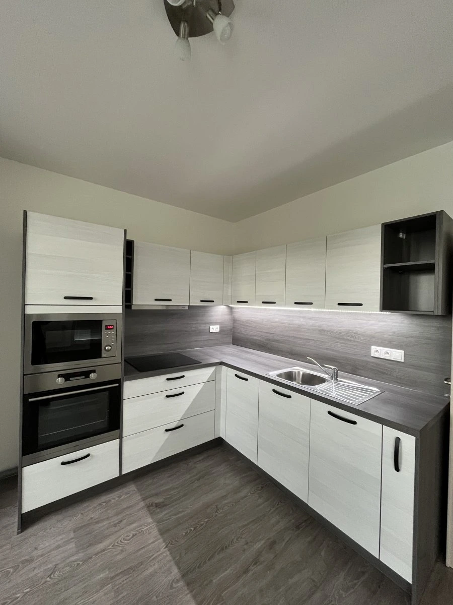 Byt se nabízí nevybavený. V praktické kuchyni se nachází kuchyňská linka s indukční varnou deskou, troubou, digestoří, mikrovlnnou troubou a myčkou.