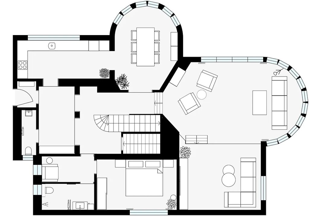 V přízemí je dominantou členitý obývací pokoj s krbem o rozloze 51,3 m2 a prostorem, který lze využít pro kulečník, domácí kino, nebo chillout zónu. Nabízí se i možnost ho příčkou rozdělit a vytvořit další místnost.