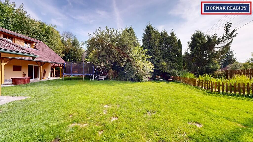Venkovní prostor tvoří rozlehlá zahrada vybízející k odpočinku i zábavě se spoustou malebných zákoutí. Kryté posezení s grilem, ohniště, dětské hřiště s trampolínou a pískovištěm. V horní části zahrady pak stojí menší přístřešek.