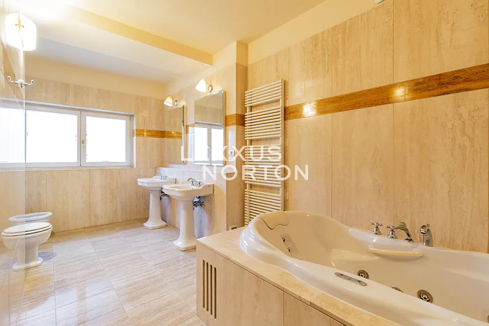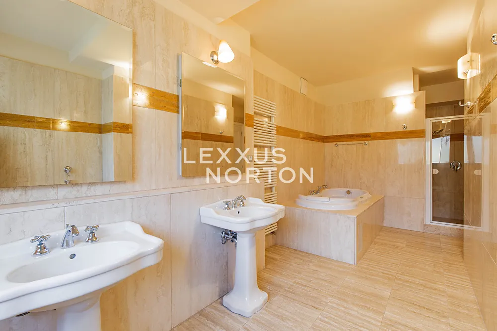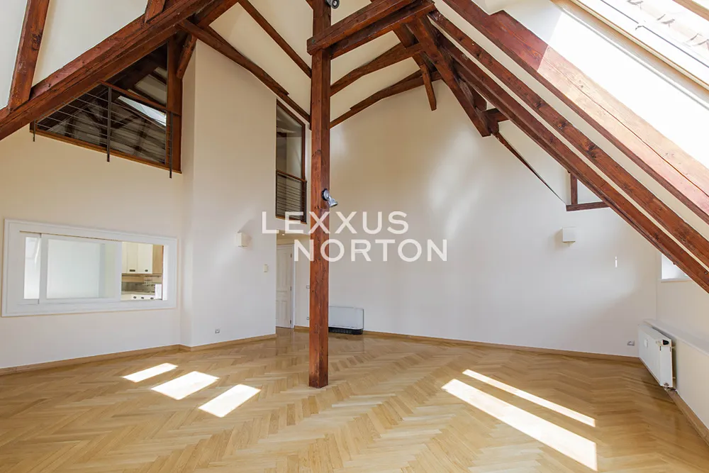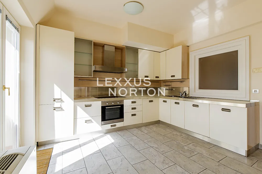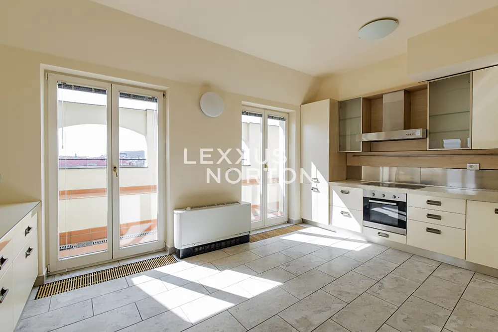 Tento světlý nezařízený byt k pronájmu nabízí ve spodním patře vstupní chodbu, prostorný obývací pokoj, plně zařízenou kuchyň (sklokeramická deska, trouba, lednice, mrazák, myčka nádobí a mikrovlnná trouba), ložnici se vstupem na balkon, s vlastní šatnou a koupelnou (sprchový kout, vana, toaleta, bidet), 2 ložnice také se vstupem na balkon, koupelnu (vana, toaleta, bidet), šatnu a komoru. V patře se nachází galerie, kterou lze využít jako další ložnici nebo společenskou místnost, koupelnu (sprchový kout, toaleta, bidet), prádelna (pračka a sušička) a terasa o velikosti 35 m2, která nabízí krásný výhled na Pražský hrad a Petřín. Budova je po kompletní rekonstrukci a nabízí služby recepce (od 8:00 do 21:00). K dispozici je také sklep a možnost pronájmu garážového parkovacího stání v zakladači za extra měsíční poplatek 3 900 Kč + DPH.