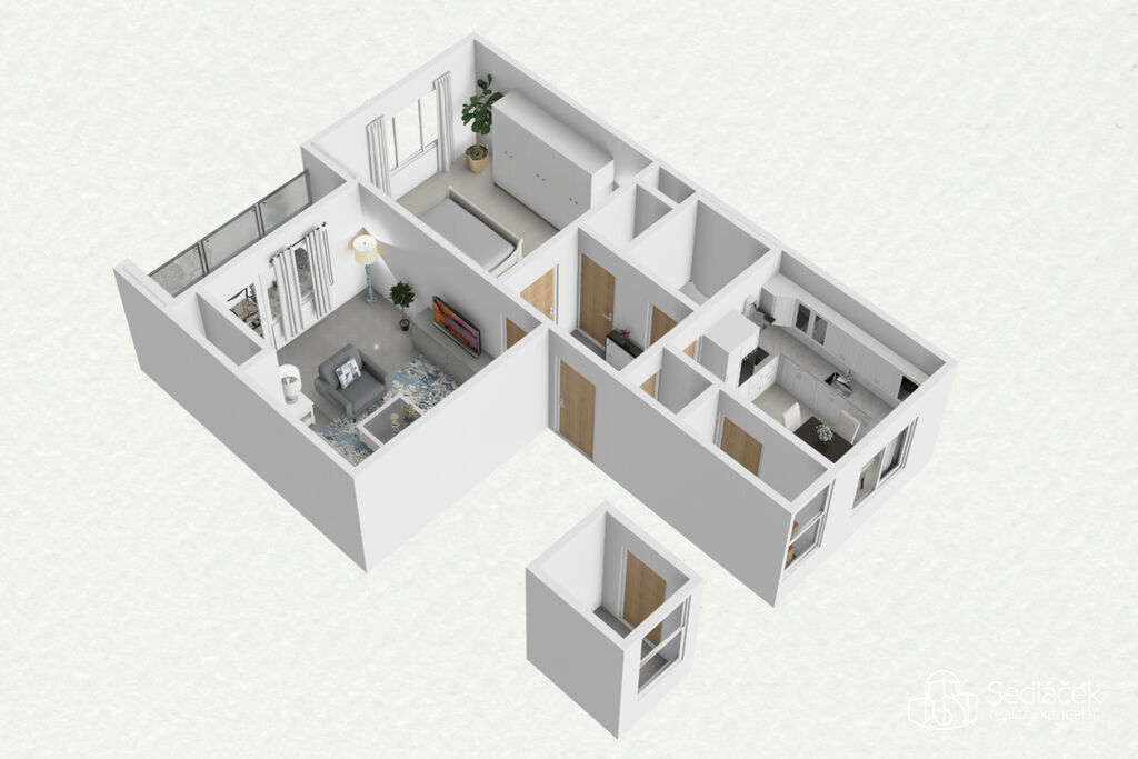 Součástí inzerce jsou také vizualizace interiéru, které slouží pouze pro ilustraci možné podoby bytu po rekonstrukci.