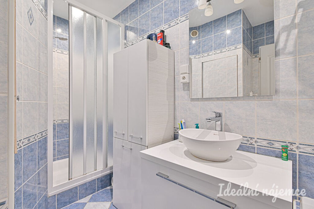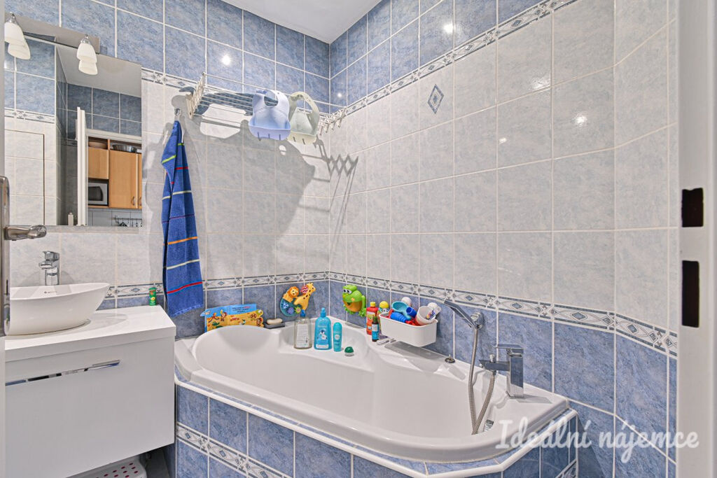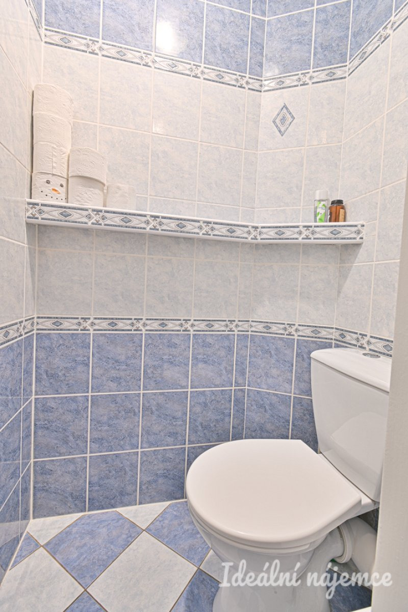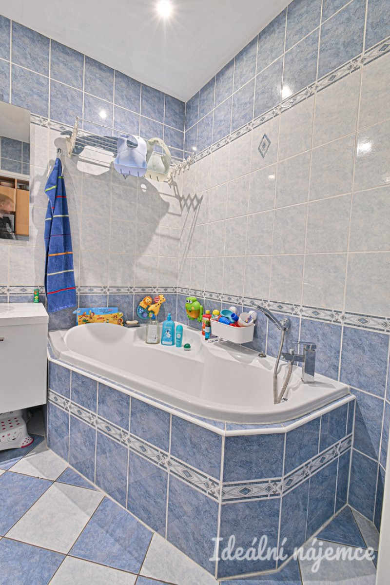Koupelna je zařízena prostornou vanou i sprchovým koutem a umyvadlem se skříňkou. Toaleta je oddělená.